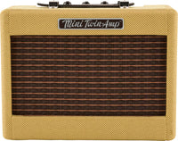 - Q: What materials are used in the construction of the Fender Mini 57 Twin-Amp? A: The amplifier is covered in tweed material, which is characteristic of vintage Fender designs.