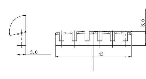 - Q: What are the dimensions of the Guyker 43mm Guitar Brass Nut? A: The Guyker 43mm Guitar Brass Nut has a length of 43mm (1.69”), thickness of 5mm (0.20”), and a height of 8mm (0.31”). The distance from E string to E string is 36mm (1.42”).