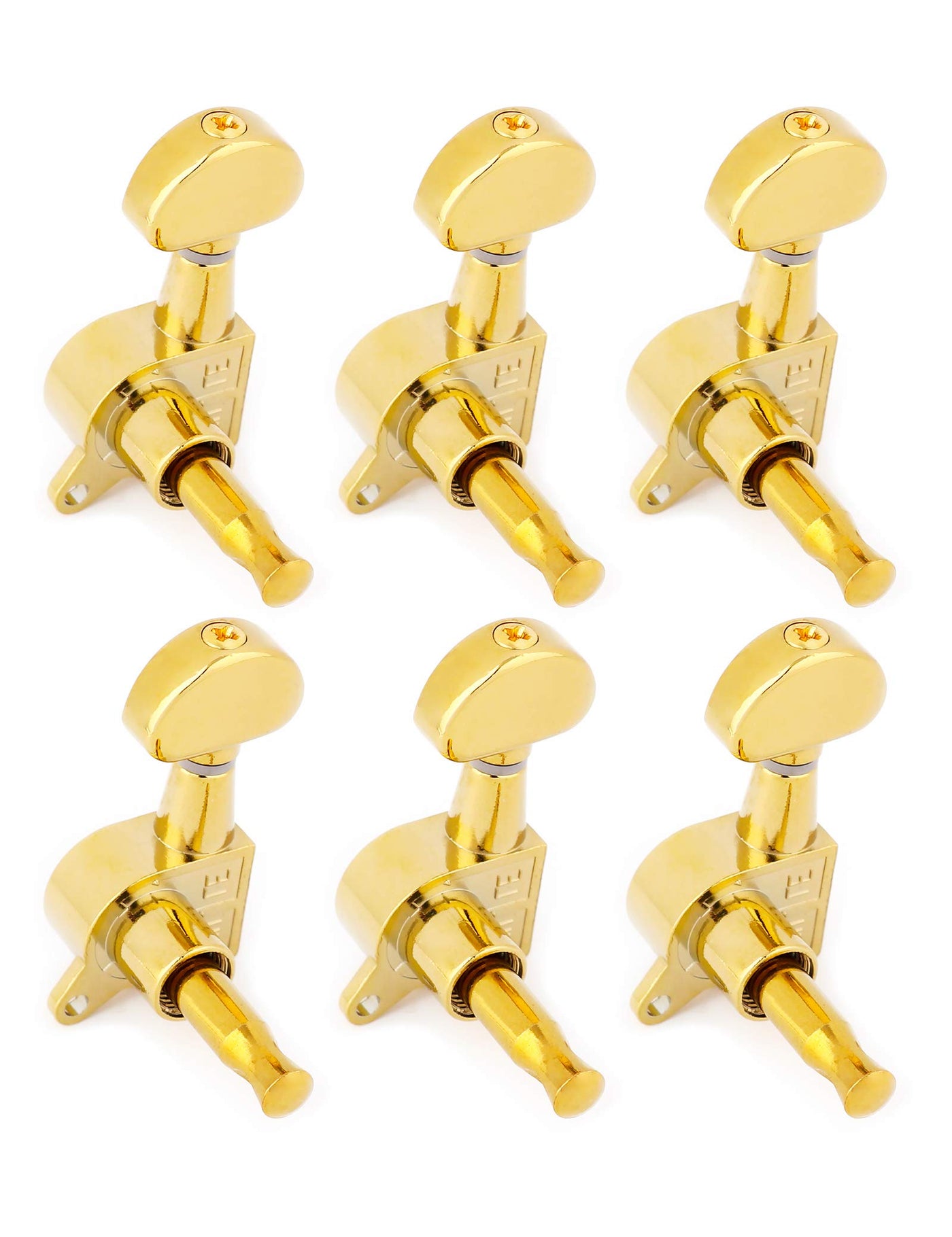 PRODUCT DESCRIPTION These tuners are quality tuners made of zinc alloy construction Compatible with steel string (Electric or Folk) guitar Sets of 6pcs machine heads with mounting screws bushings and washers 10mm (13/32'')-diameter pegholes required Heavy duty internal gear & standard size Location: 6 right handed tuning pegs Color: Gold Gear ratio: 1:14 Brand: Holmer PACKAGE INCLUDE 6 x Right guitar machine heads 6 x ferrules 6 x screws NOTE Due to the difference between different monitors, the picture may not reflect the actual color of the item Due to manual measurement, there may be 1-2mm error in size