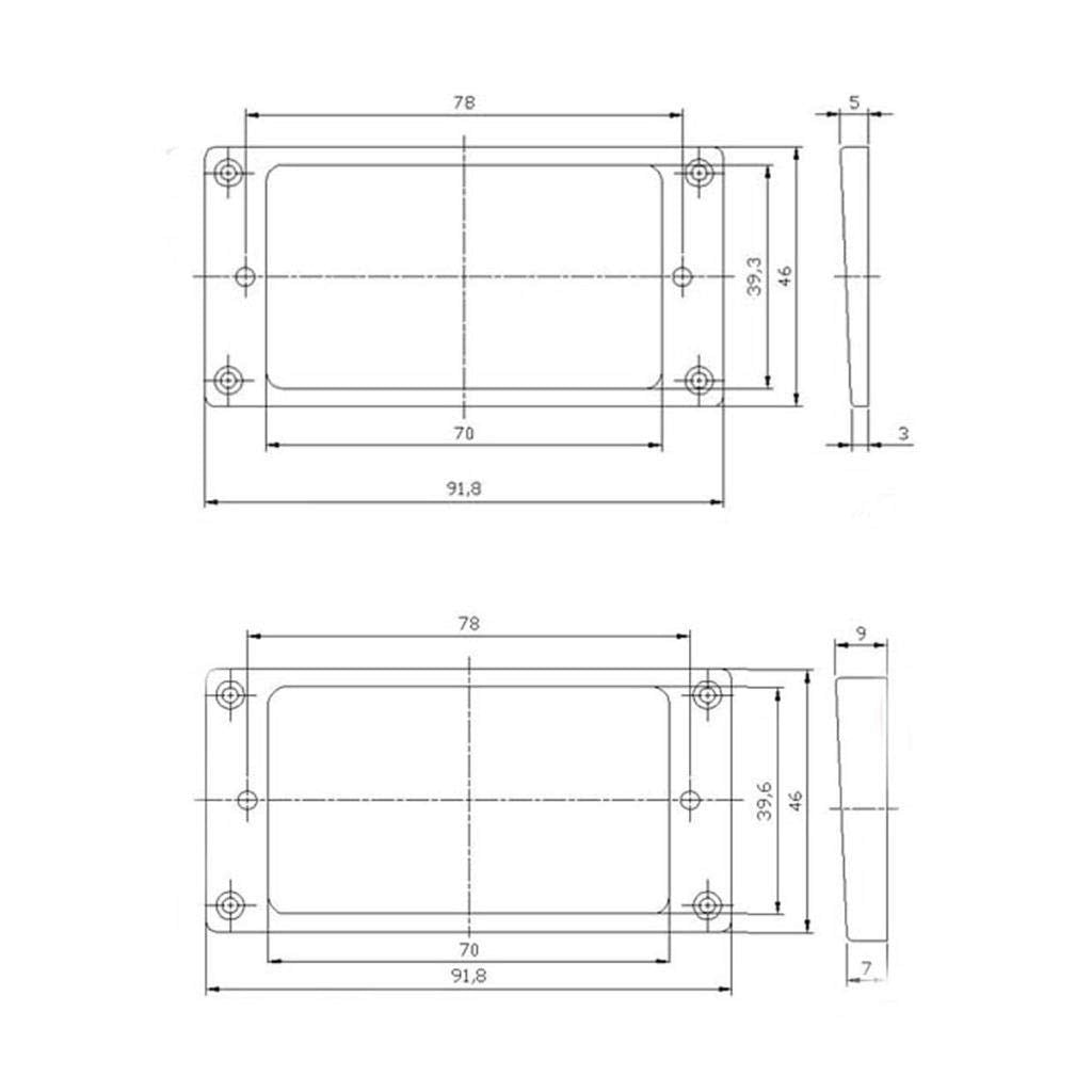 • Q: What are the dimensions of the pickup rings? A: The pickup rings have a space for humbucker pickups measuring 70x39.3mm, with a distance of 78mm between the two pickup height screws. The frame height is available in two sizes: 3x5mm and 7x9mm.