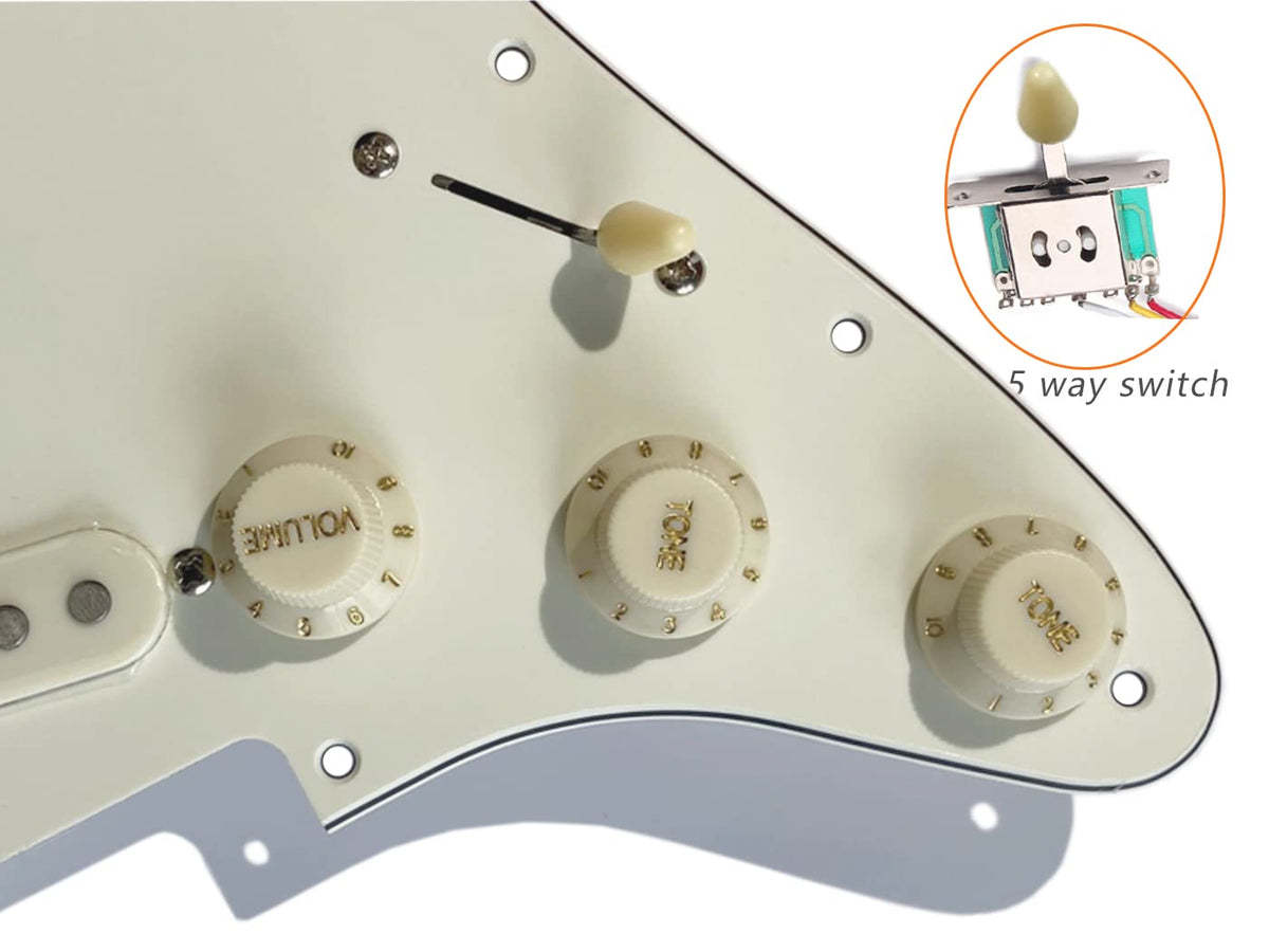 - Q: Does the pickguard come fully loaded? A: Yes, the LAMSAM pickguard comes fully loaded with pickups and controls, including a 5-way pickup switch, one volume pot, and two tone pots.