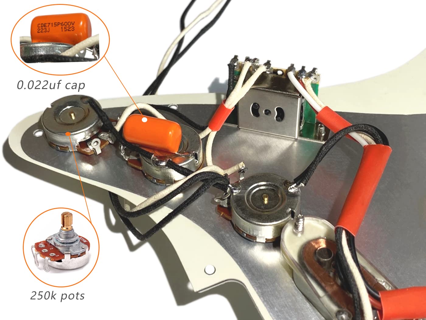 - Q: What are the specifications for the electronics in the pickguard? A: The electronics include an imported 5-way pickup switch, full-size A250/B250k potentiometers, and a 0.022uf, 600V orange capacitor.