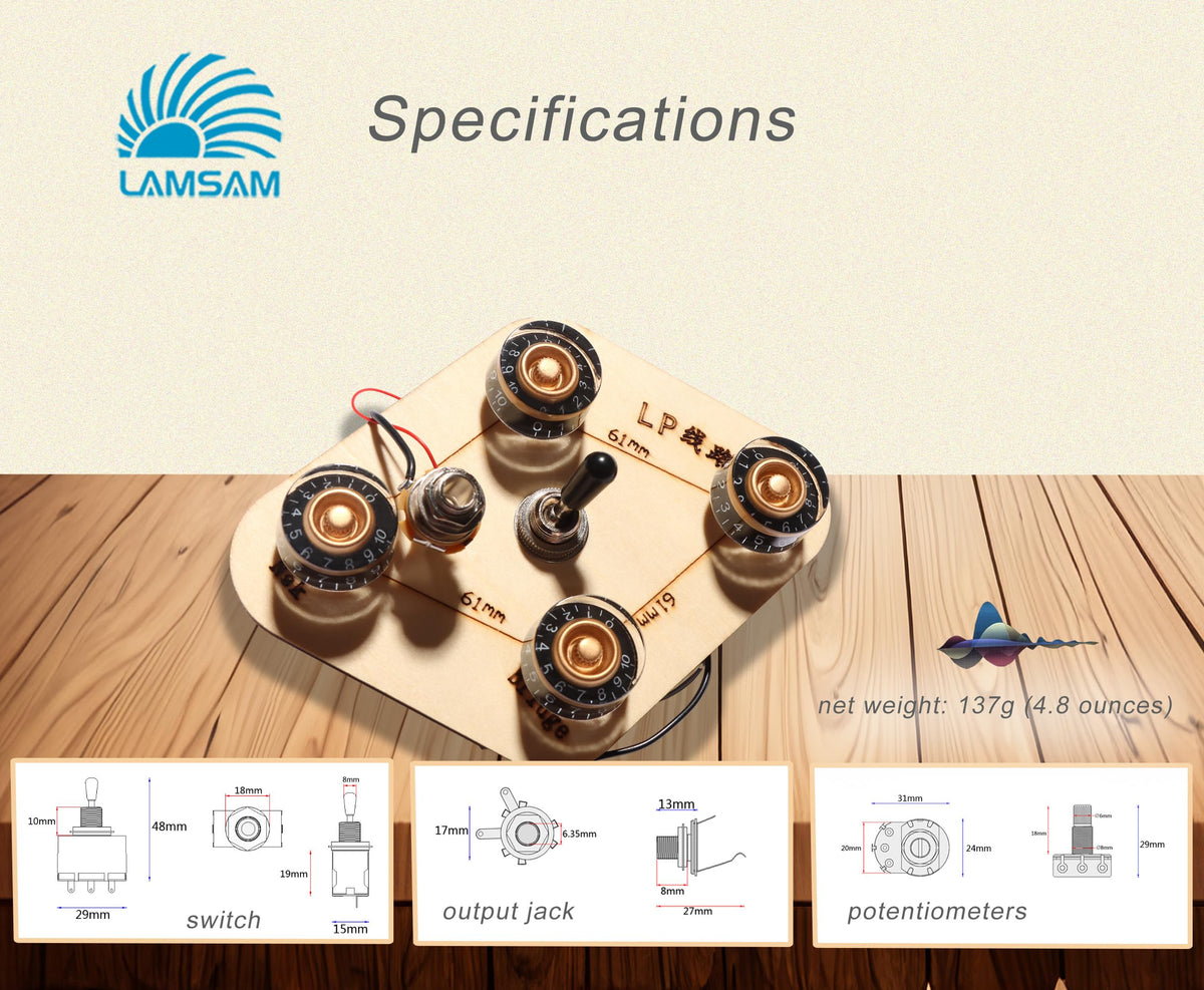 - Q: What is included in the LAMSAM prewired wiring harness kit? A: The kit includes 1 x sealed 3-way toggle switch and its tip, 4 x 500kΩ pots with control knobs, 1 x 1/4'' mono output jack, 2 x 0.022uF orange capacitors, and 1 x wiring diagram.