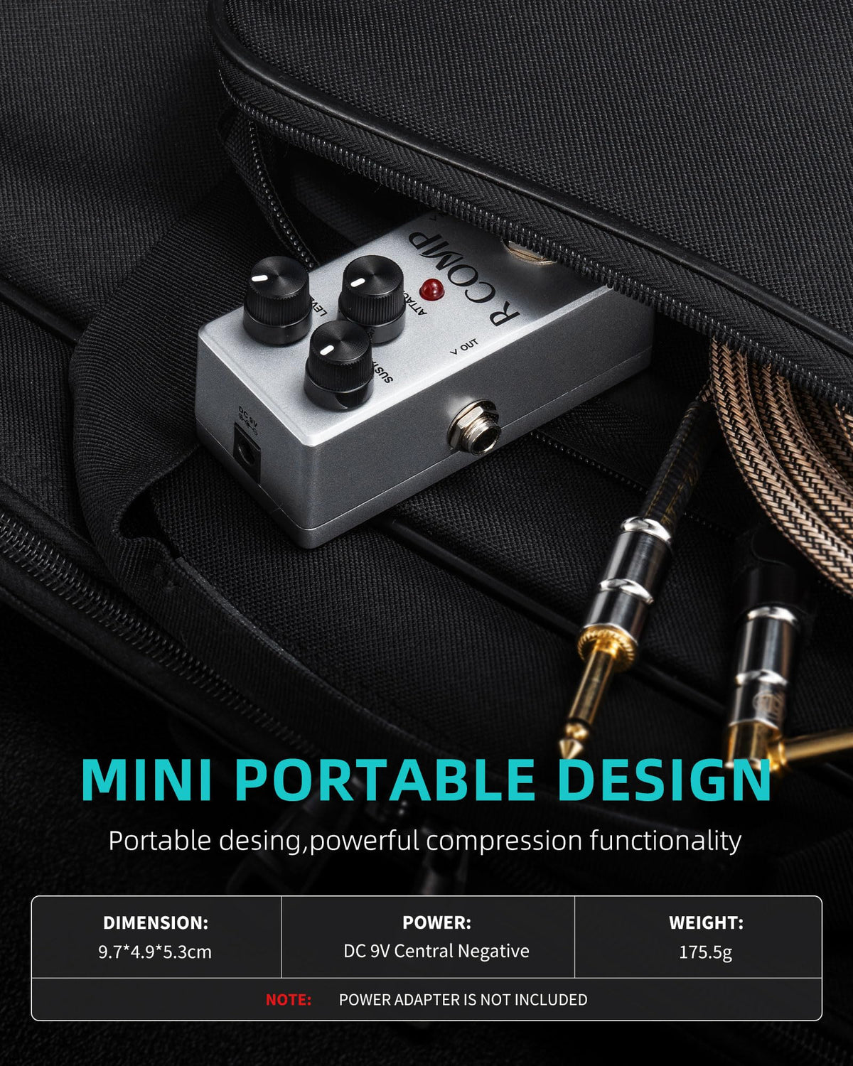 • Q: What is the size of the LEKATO Compressor Pedal? A: The LEKATO Compressor Pedal is a mini-sized pedal, making it compact and easy to fit on any pedalboard.