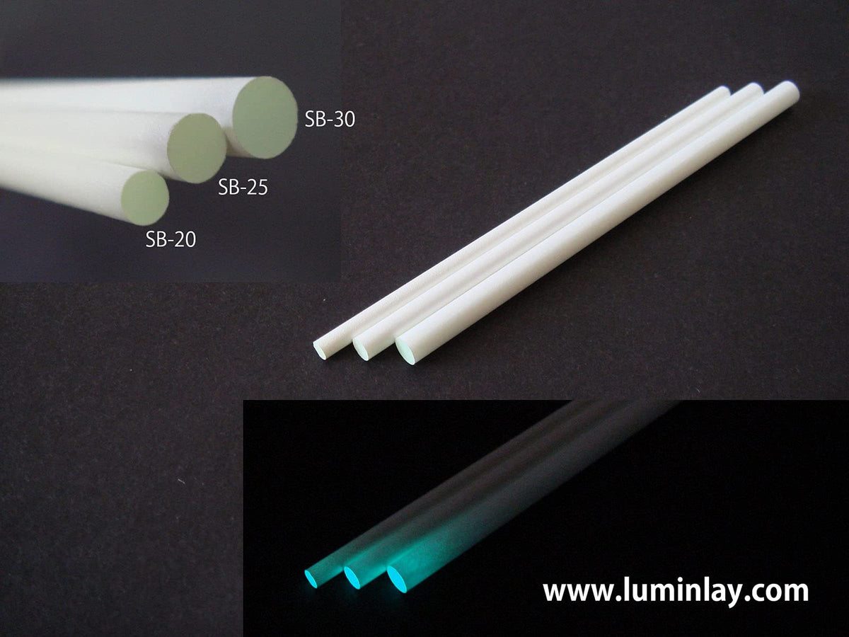 Luminlay materials are made of highly mixed high quality glow in the dark materials and high clear PMMA plastics. The outside is painted white so as not to lose the glow. SB series Glow BLUE long time glow type SG series Glow GREEN strong glow type General Q & A Q:How long will the Luminlay continue emitting light ? A:If you charge a Luminlay dot just for several seconds, you can have enough emission of light for about 20 minutes. The emission will be weaker as time passes, but, when in a really dark room, you can see that the Lumilay dots continue to be luminous all night long. Actually, on a stage, the darkness will not continue so long, and when the stage is lighted, Luminlay can be charged also by the stage lights. The fact that many professional guitar/bass players love using Luminlay proves the effectiveness. Q:How long and how many times can Luminlay be effective? A:Once Luminlay is installed, you can use it semi-permanently. Q:What are the characteristics of blue and green A:green is brighter at the beginning, but blue is better in persistence. Anyway, you can obtain enough brightness from both, and you can choose the color as you like.