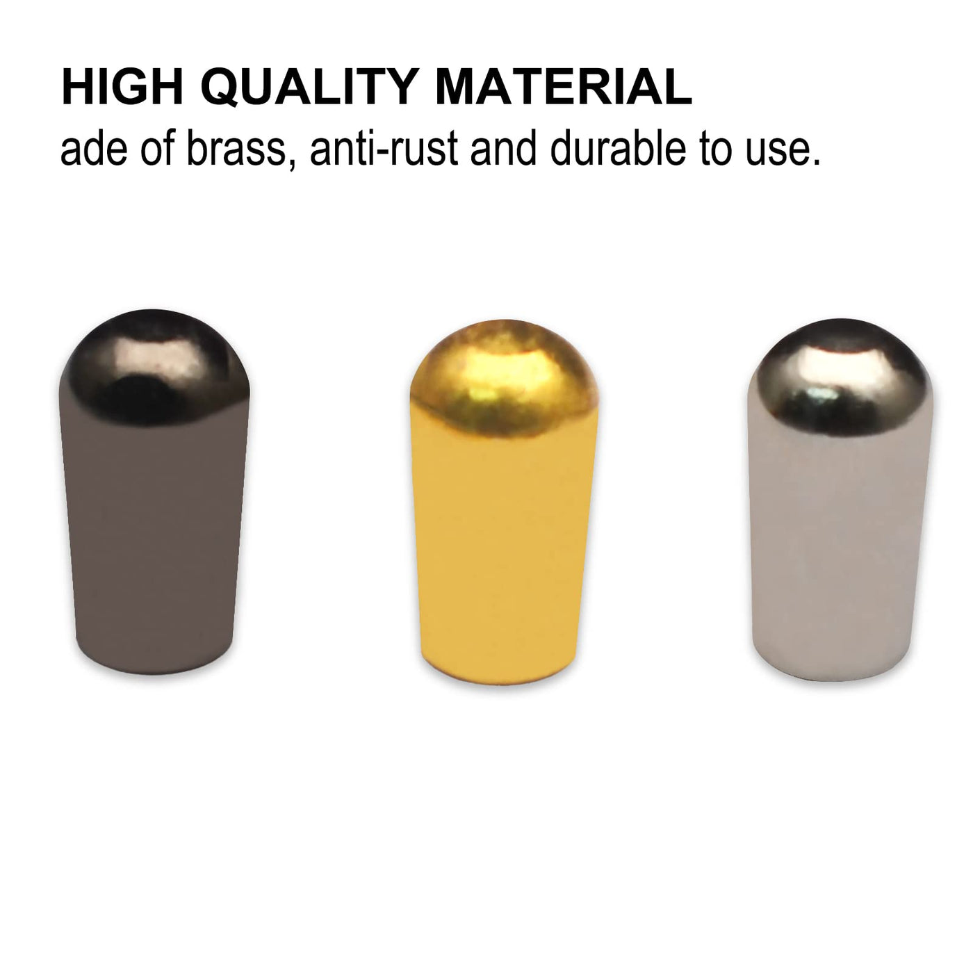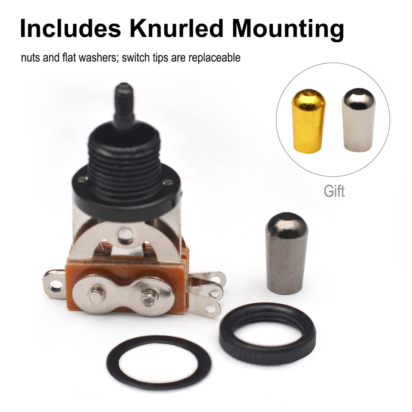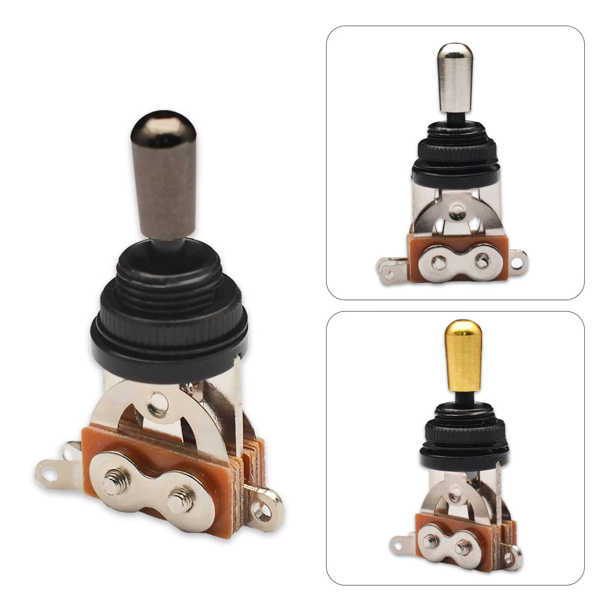 - Q: What does the package include? A: The package includes 1 metal 3 way guitar toggle switch and 3 brass tip knobs in black, chrome, and gold.