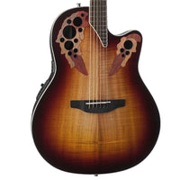 Product DescriptionThe Celebrity Elite Plus series builds on the classic multi-sound hole instrument design of the Celebrity Elite guitars, upgrading them with select figured tops, beautiful abalone appointments and first-rate sound, style and features. The Celebrity Elite Plus CE48P-KOA guitar has the classic Super Shallow Lyrachord cutaway body with a Figured Koa Top. This top features the Elite multi-soundhole design, which provides clear highs, focused, and balanced bass response. For the tops quartersawn scalloped X bracing, we reviewed earlier Ovation bracing patterns extensively and arrived at a remarkable new design that borrows from the past and is voiced for the present. With natural tone and optimal response and power, the body, top and sound holes create the classic Ovation Elite sound, resonating with full projection, remarkable note clarity and balance, and nuanced tonal complexity. The top is complete with white binding and a beautiful transparent Sunburst finish. Other premium features include an effortlessly playable satin-finish neck, 10 -radius rosewood fret board with 20 fully accessible frets (24 frets for high E string), Pearloid inlays, and a rosewood bridge. The CE48P-KOA features an Ovation Slimline pickup and OP-4BT preamp system with three-band EQ, volume/gain control, onboard tuner and low-battery light.From the ManufacturerNow that's Exotic. Beauty. Art. Design. All of the playability and pristine live sound of the Celebrity Collection Elite is visually enhanced with a stunning layer of exotic wood for the Celebrity Collection Elite Exotic line. Performance-ready guitars with Ovation's unqiue multi-soundhole design give you clear highs and a focused, balanced bass response. The exotic top has detailed laser-cut epaulets that add to the uncommon appearance and sonically provide remarkable note clarity. A satin-finished neck, Ovangkol fretboard and bridge all combine to make playing effortless and responsive. All Celebrity Elites were designed with live performance in mind; the Ovation Slimline pickup and OP-4BT preamp system with a three-band EQ, volume/gain control, onboard tuner and low-battery light make it easy to dial in your sound. Discover the classic Ovation Elite sound: articulation and balance, projection, and nuanced tonal complexity.
