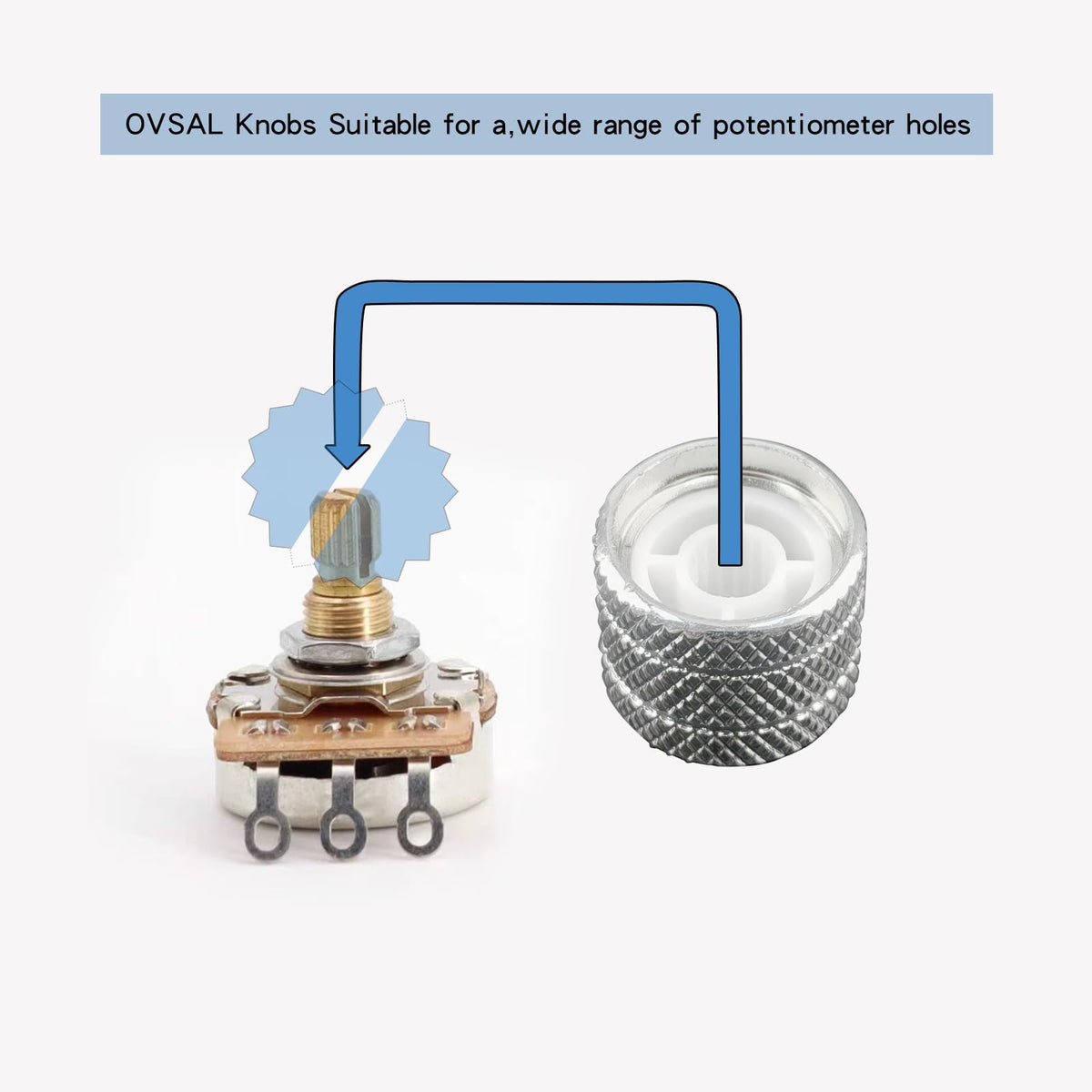 - Q: What colors are available for these guitar knobs? A: The OVSAL guitar knobs come in multiple color options, including chrome, gold, black, and electroplated finishes.