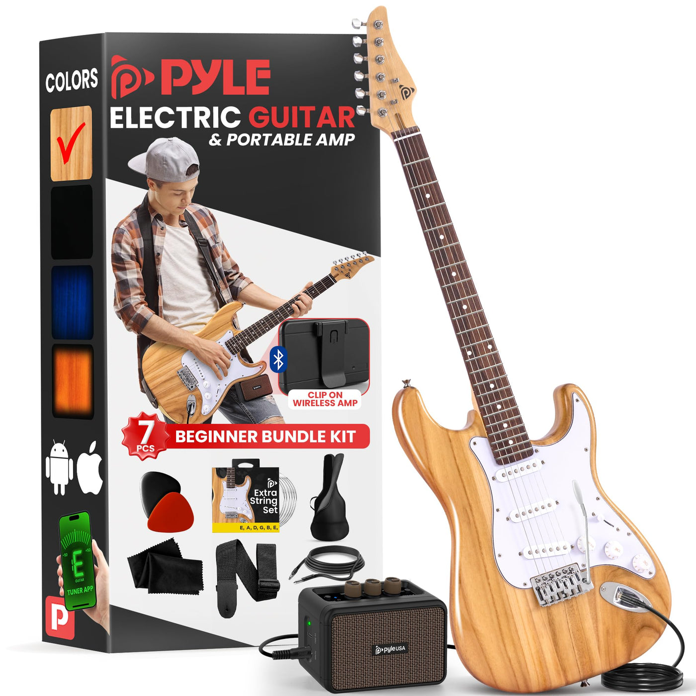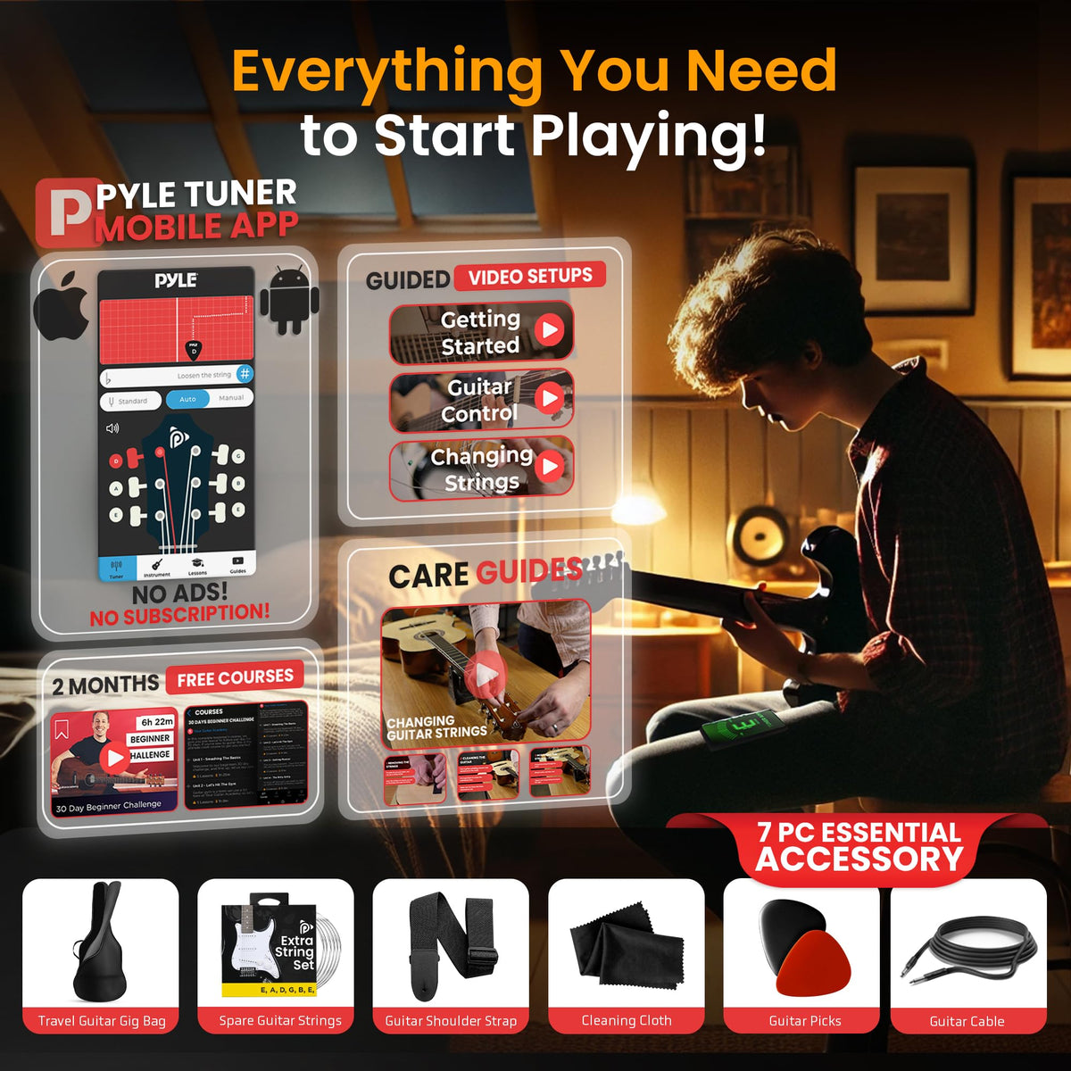- Q: What is included in the Pyle Full Size Electric Guitar Kit? A: The kit includes a full-size 6-string electric guitar, a 5W amplifier, a gig bag, spare strings, a shoulder strap, and six picks, making it a complete set for beginners.