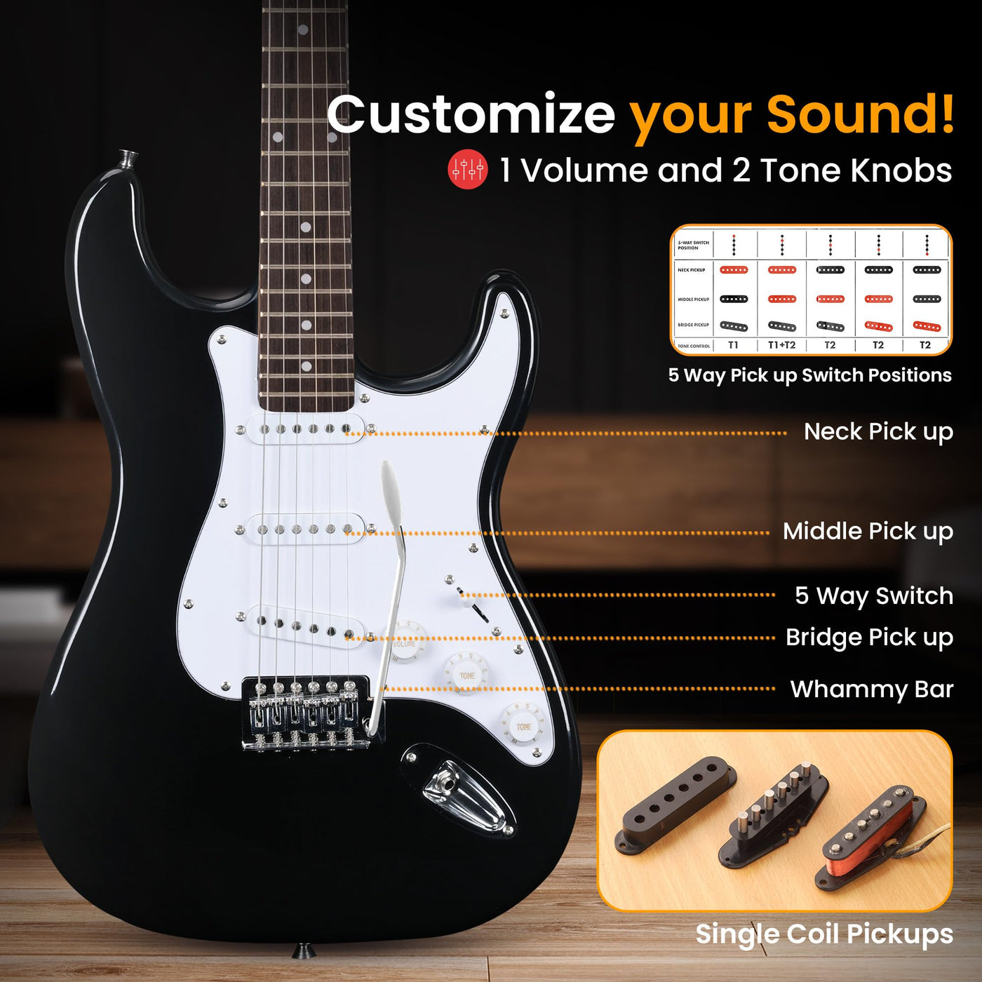 - Q: Can I practice silently with this guitar kit? A: Yes, the amplifier features a headphone output, allowing for silent practice sessions without disturbing others.