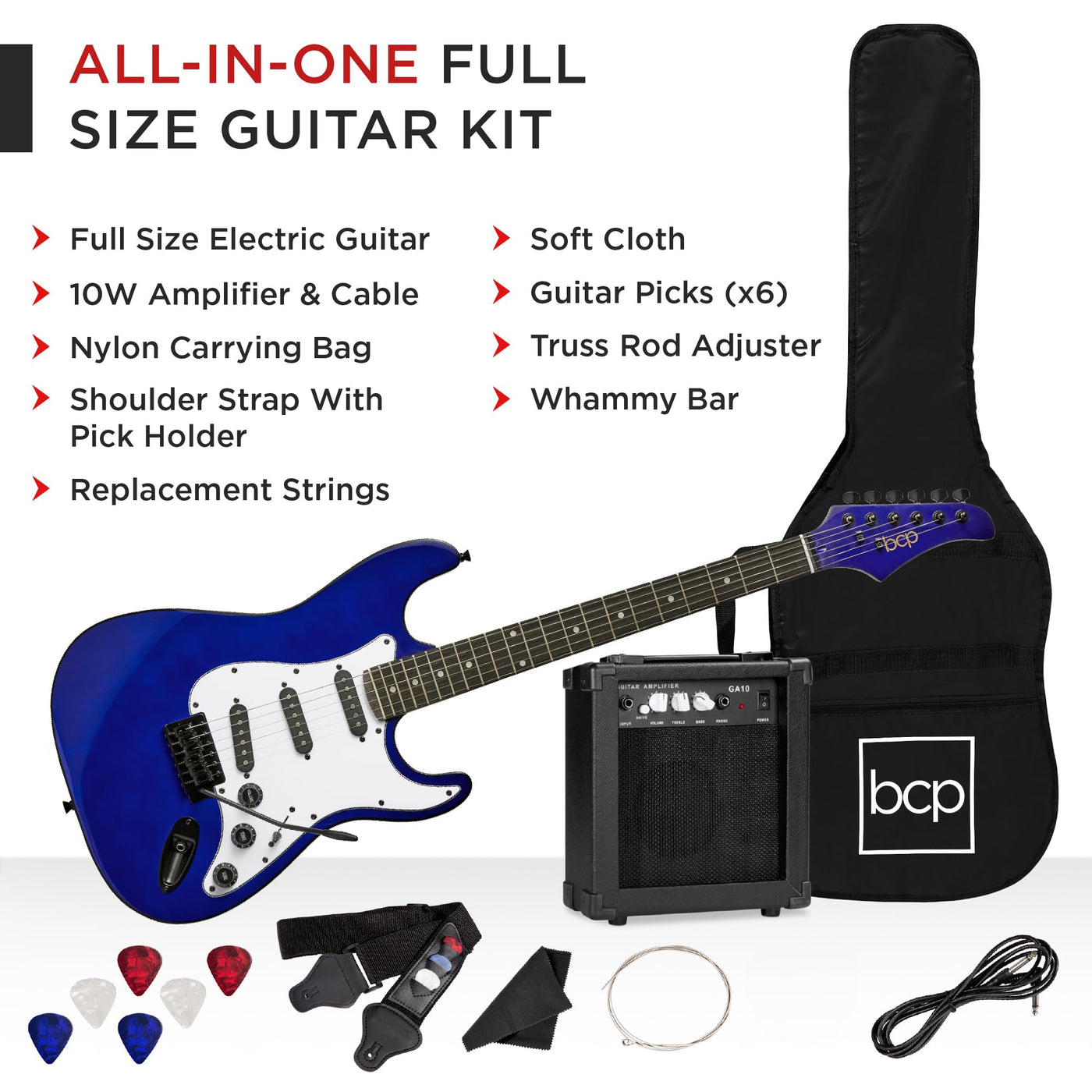 - Q: What is included in the Best Choice Products Electric Guitar Starter Kit? A: The kit includes a 39-inch electric guitar, a 10W amplifier, an amp cable cord, a guitar pick, a whammy bar (tremolo bar), a shoulder strap, replacement strings, and a nylon carrying bag.