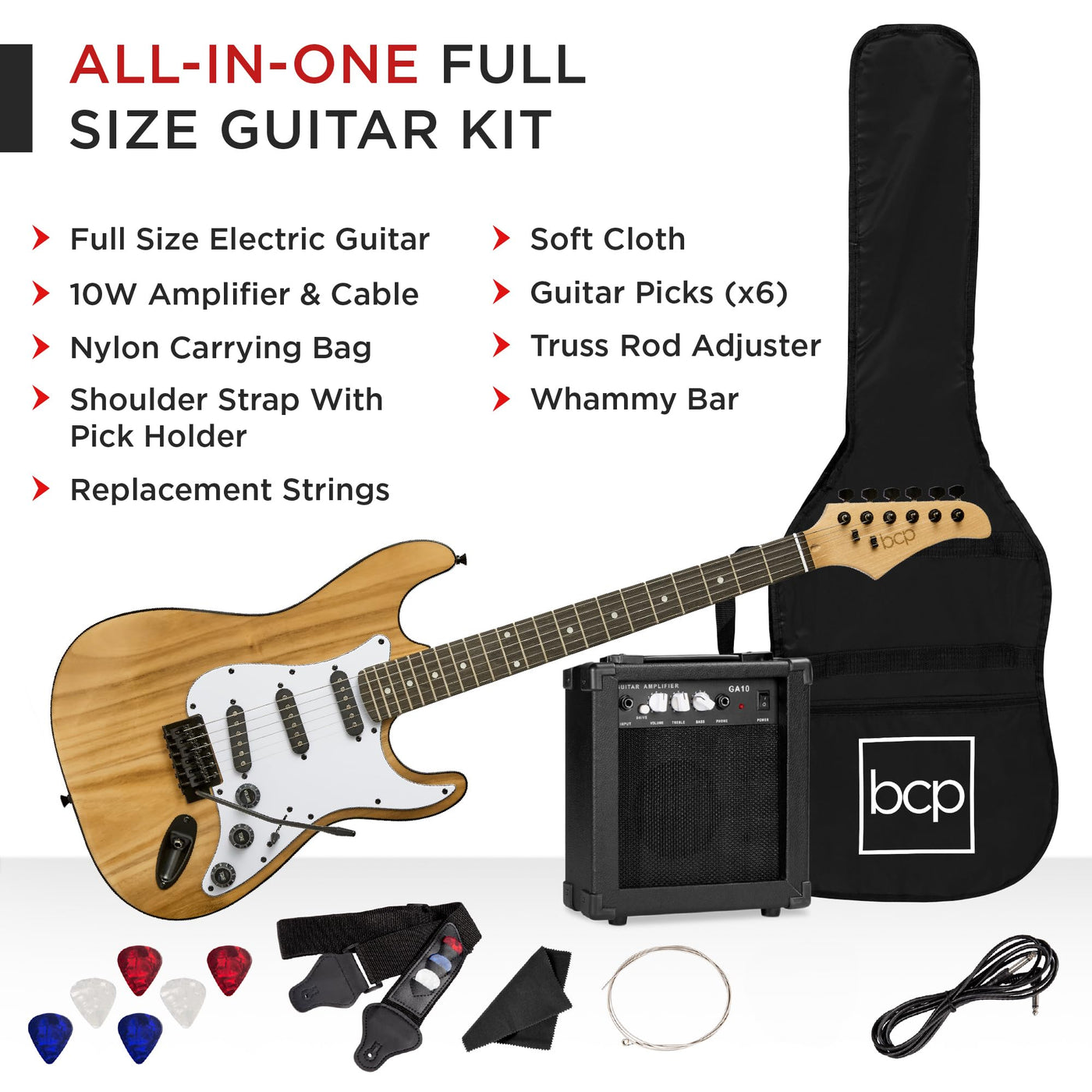 - Q: What is included in the Best Choice Products 39in Full Size Beginner Electric Guitar Starter Kit? A: The kit includes an electric guitar, a 10W amplifier, an amp cable cord, a guitar pick, a whammy bar (tremolo bar), a shoulder strap with an attached pick holder, replacement strings, and a nylon carrying bag.