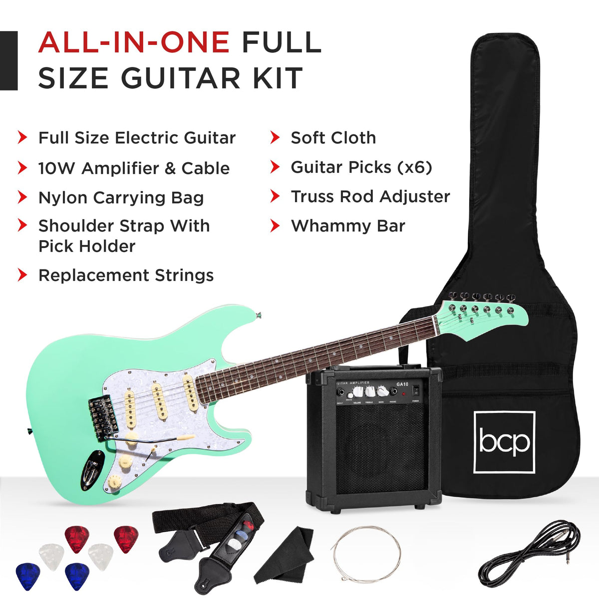 - Q: What type of amp comes with the electric guitar starter kit? A: The starter kit includes a 10W amplifier with dimensions of 10 inches in length, 3.25 inches in width, and 10.5 inches in height.