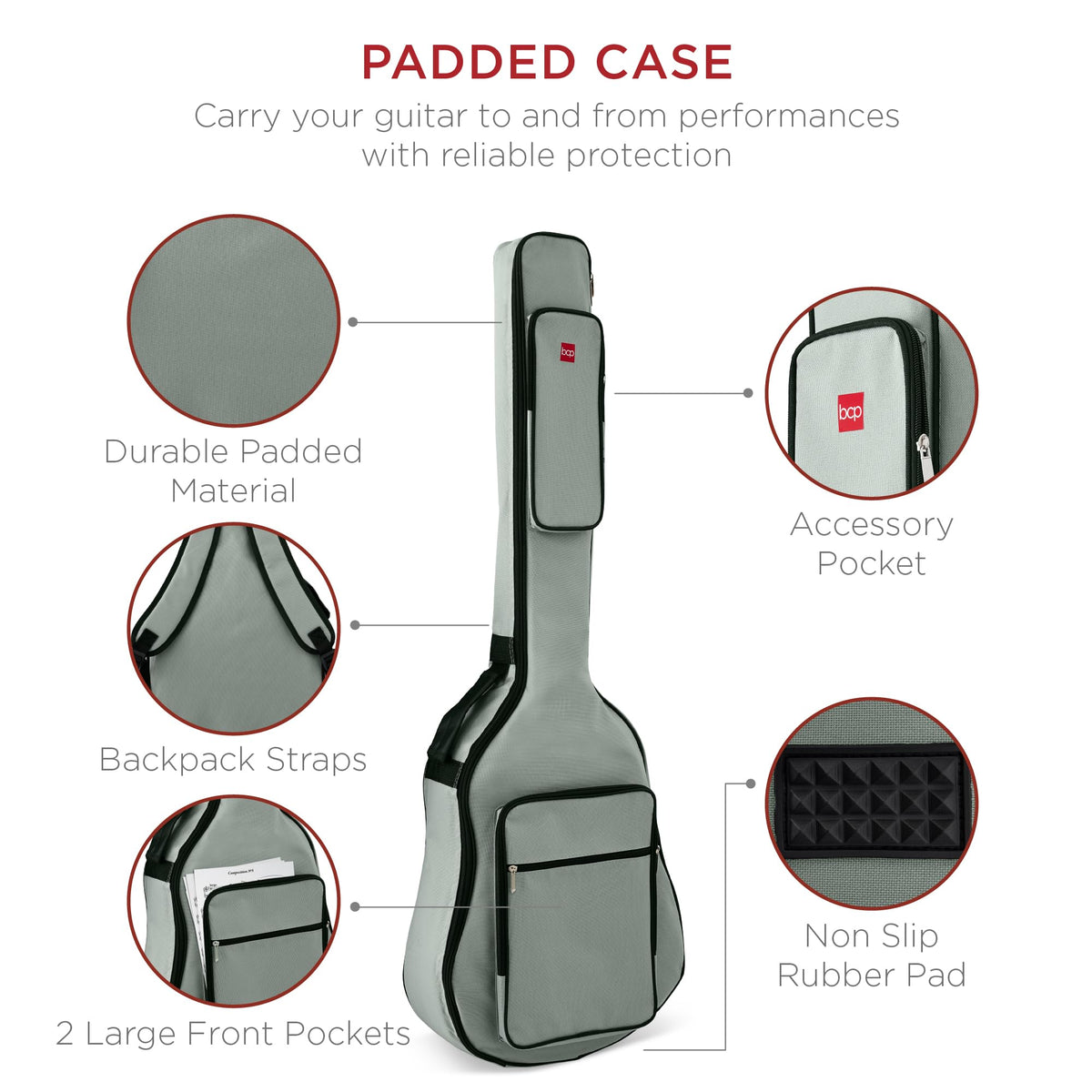- Q: What type of case is included with the guitar? A: A padded gig bag with backpack straps, three storage pockets, and a non-slip rubber pad is included for convenient carrying.
