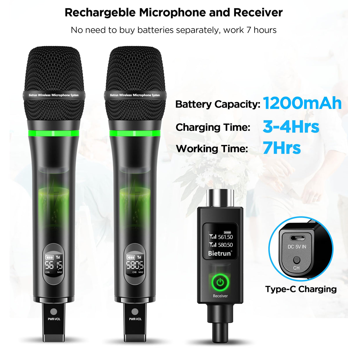 - Q: How long does the battery last on the Bietrun microphone? A: The rechargeable lithium-ion battery provides up to 7 hours of working time after a charging period of 3 to 4 hours.