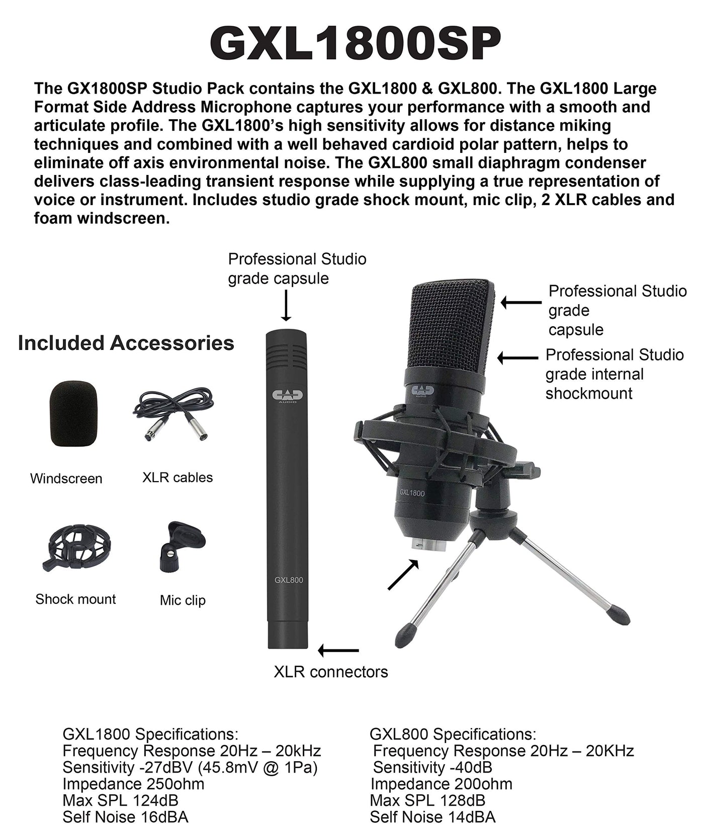 - Q: What microphones are included in the CAD Audio GXL1800SP Studio Pack? A: The CAD Audio GXL1800SP Studio Pack includes the GXL1800 Large Format Side Address Microphone and the GXL800 Small Diaphragm Microphone.