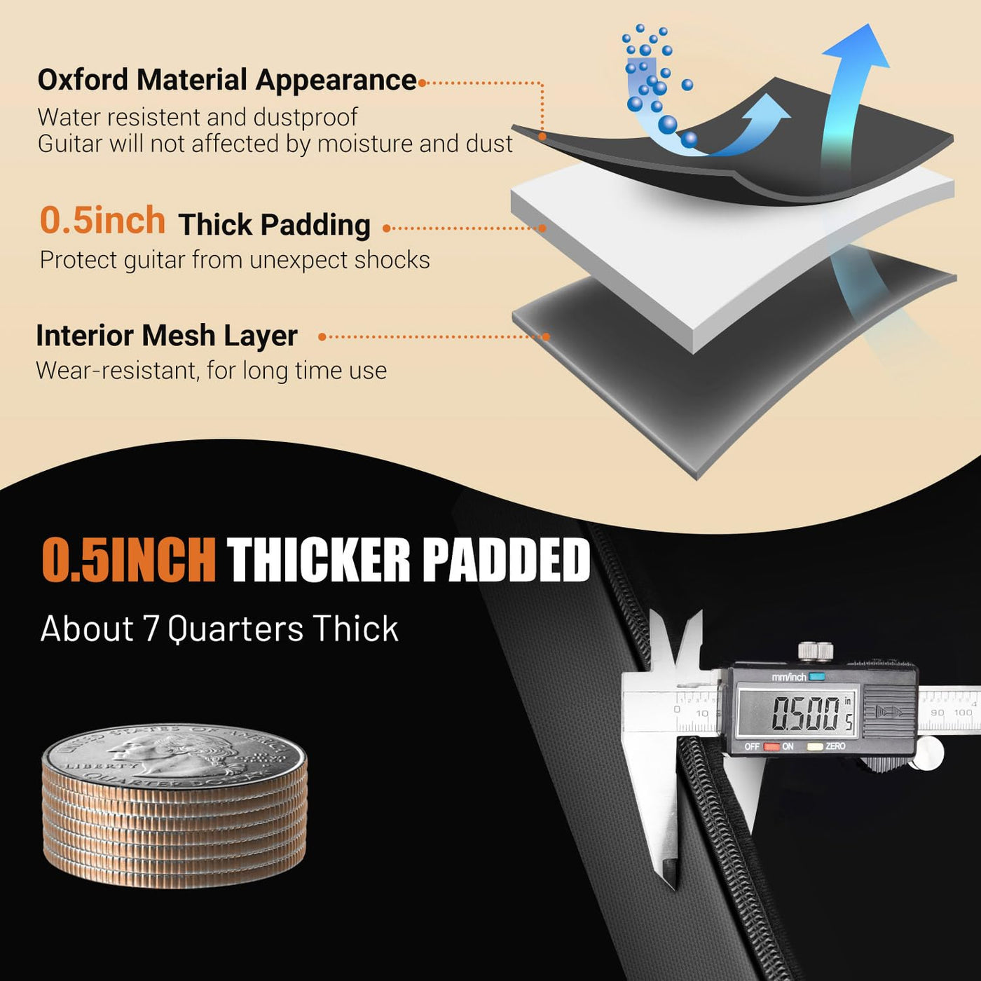- Q: What type of padding does the guitar bag have? A: The guitar bag features 0.5 inches of thick padding, providing protection against bumps and impacts.