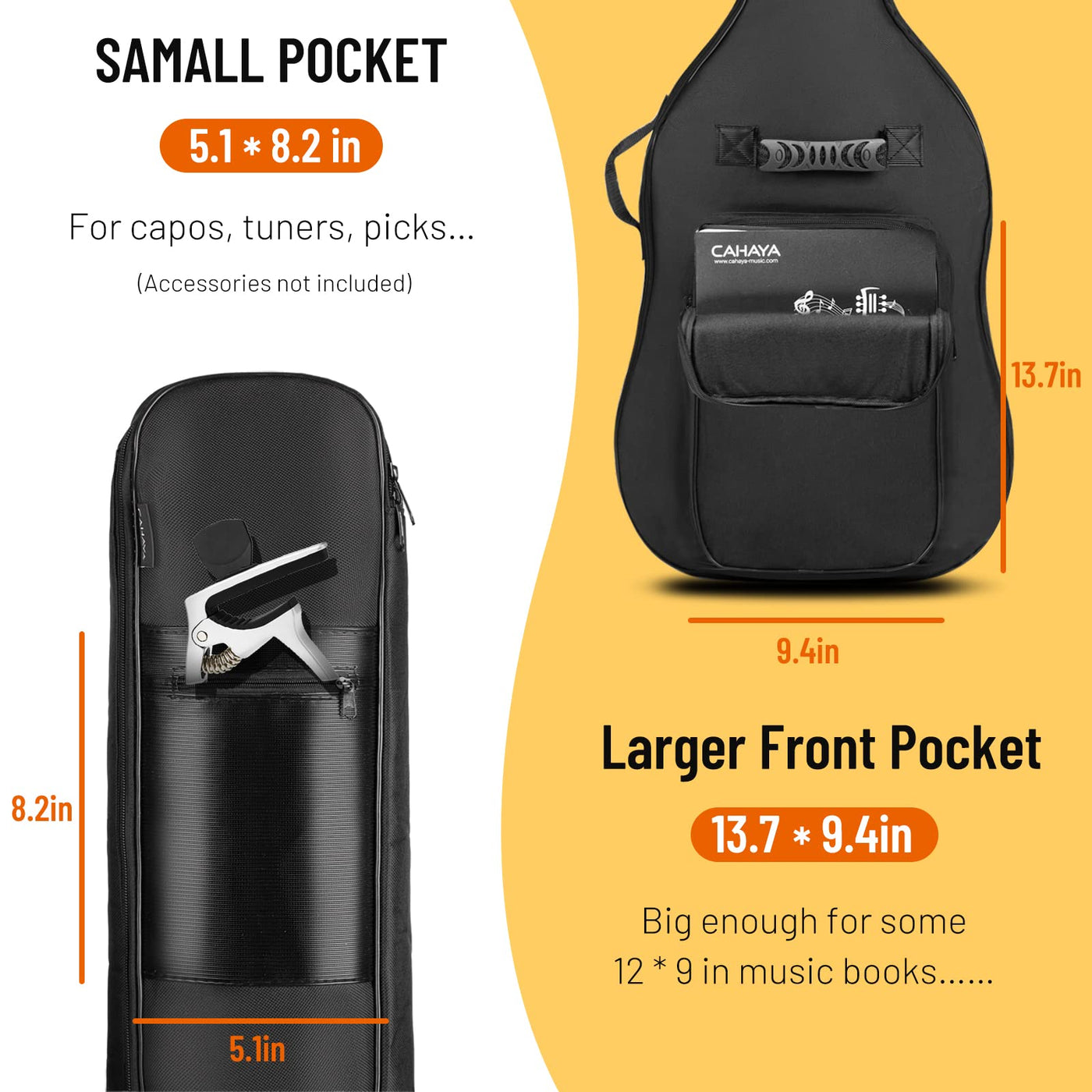 • Q: Does the bag have any storage pockets? A: Yes, the bag includes a large front pocket measuring 13.7”x9.7”x2.1”, suitable for holding A4 and US letter size music sheets, tablets, and smartphones, as well as a small pocket for accessories like tuners and guitar picks.