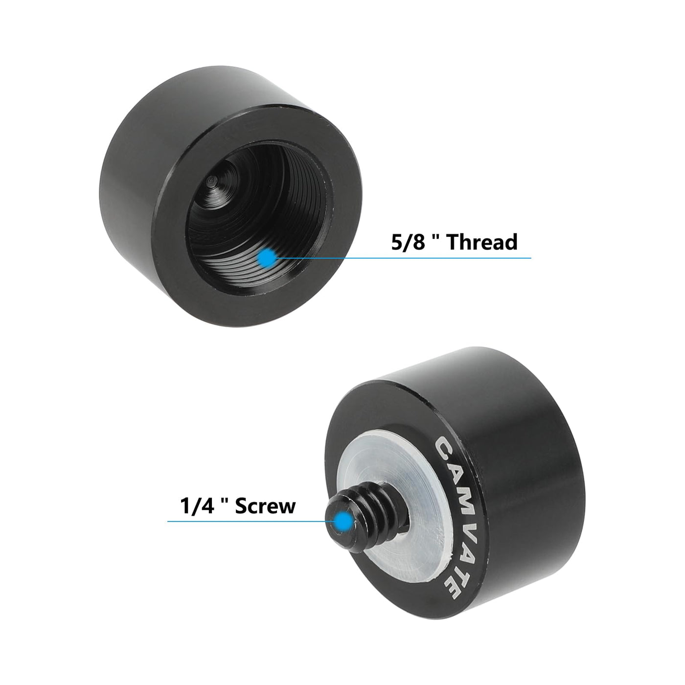 • Q: What is the purpose of the CAMVATE Mic Stand Adapter? A: The CAMVATE Mic Stand Adapter is designed to convert a 1/4"-20 thread hole to a 5/8"-27 thread hole or vice versa, allowing for versatile microphone mounting options.