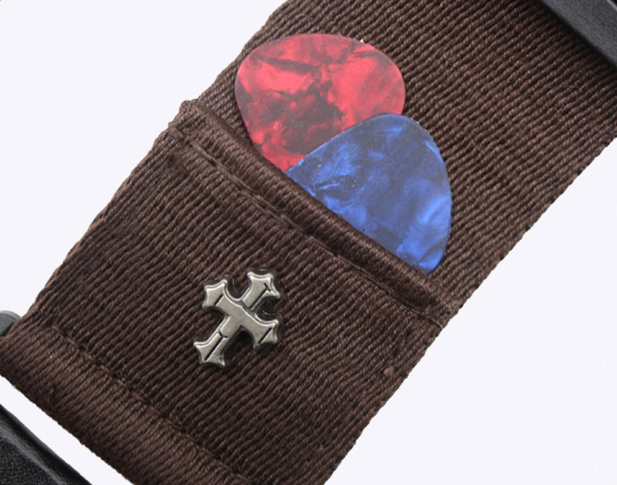 - Q: What is the design of the CC CAIHONG Guitar Strap? A: The strap features a simple vintage design with a comfortable cotton woven body and black leather ends, along with a vintage cross decoration.
