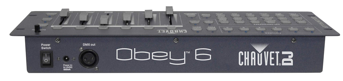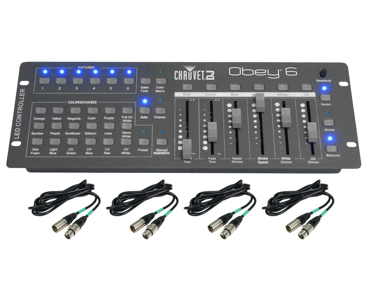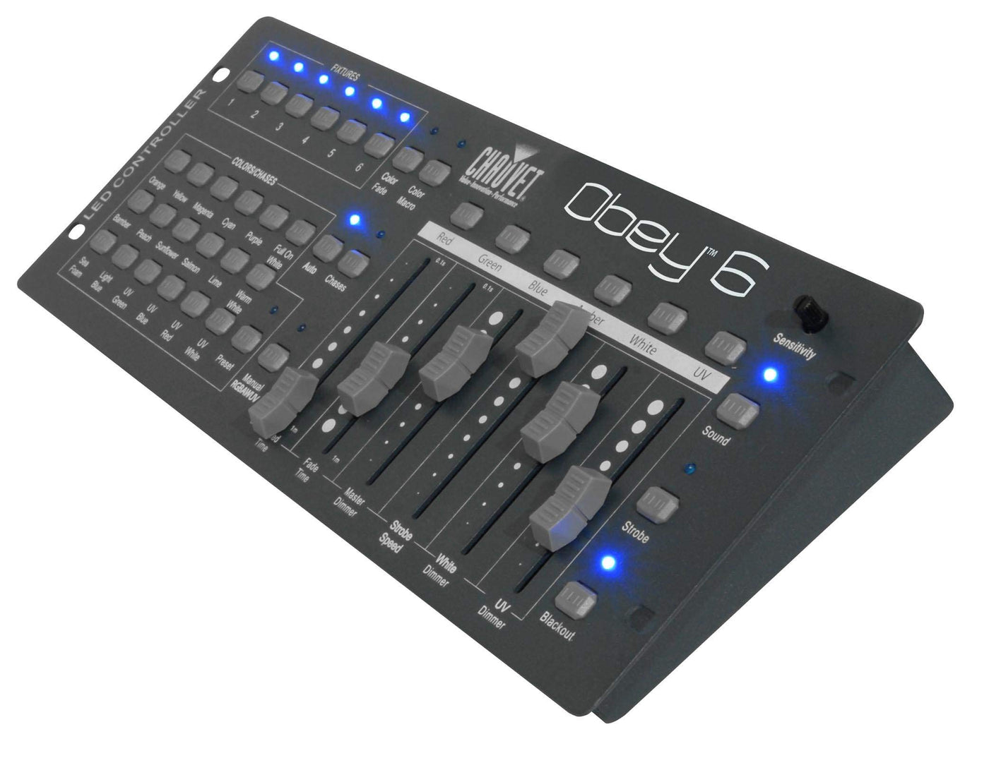 **Package Includes:** (1) Chauvet Obey 6 Light Controller (1) Chauvet DMX3P25FT Cable (3) Chauvet DMX3P10FT Cables ---------- The **Chauvet Obey 6** is a universal, compact controller ready to handle all the complexities of todays lighting fixtures. Capable of controlling up to 6 channels per fixture, the Obey 6 allows you to control effects by simultaneously operating each fixture in different playback modes, with variable fade times. Increase flexibility with playback options that include manual RGBAWUV, automated and sound-activated model. Increase control with adjustable audio sensitivity, strobe, and blackout effects.Pre-set color buttons let you easily select colors on the flyCompact and lightweightControls up to 6 fixtures individually with up to 6 channels per fixture2-year Warranty (1-year Manufacturer + 1-year VMInnovations!) PLEASE NOTE: Designed to control LED wash or spot lights. Does NOT control fog machines. Also included with the **Chauvet Obey 6** DMX Light Controller are the DMX Cables. CHAUVET produces a variety of cables for all of its fixtures, including DMX three- and five-pin connector cables in varying lengths as well as extension cables. All CHAUVET DMX cables are made specifically for lighting and meet stringent standards of suitability and quality to provide safety, shielding and prevent transmission interferences. **We are an authorized Chauvet dealer**