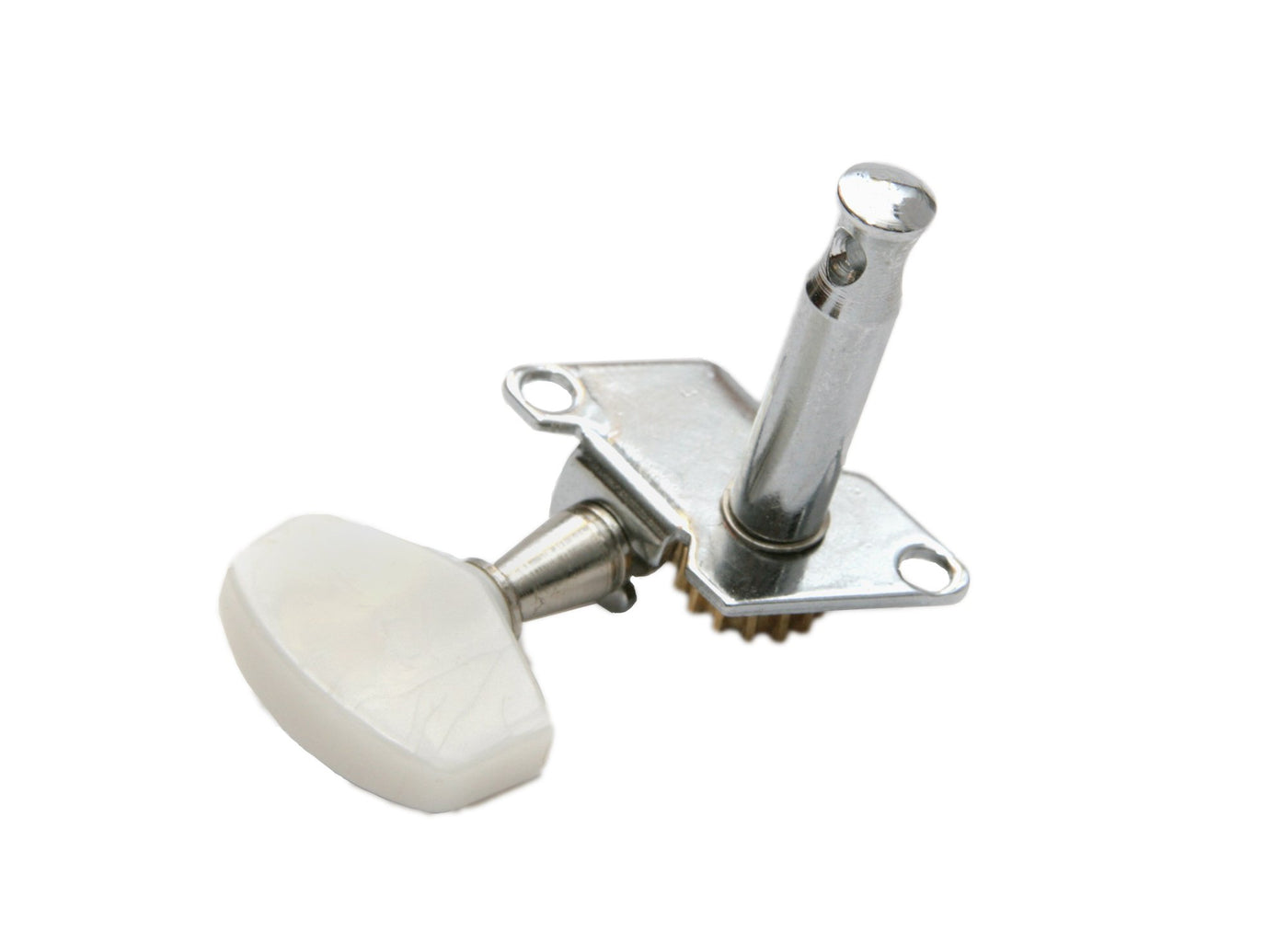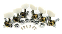 This is a set of six guitar tuners/machine heads, complete with mounting screws (12) and press-fit chromed plastic bushings (6). There are 3 tuners meant for the left side of the headstock, and 3 meant for the right side - if you need all of them to be on one side of the headstock (called 6-in-a-line), this is not the set for you! The shafts of these tuners are 1/4'' in diameter and have holes at the END (not the center). The shafts are just under 1 inch in length and the distance from the plate to the string hole is just over 7/8'' (22.5mm). These tuners can be used for repair work, new instrument building, and are especially good for Cigar Box Guitars! Please note that it is important to mount these on the correct side of the headstock, otherwise the gears may slip. Always make sure the brass gear is aligned towards the body of the instrument, and not the top of the headstock, and you'll know you have them on the correct side!