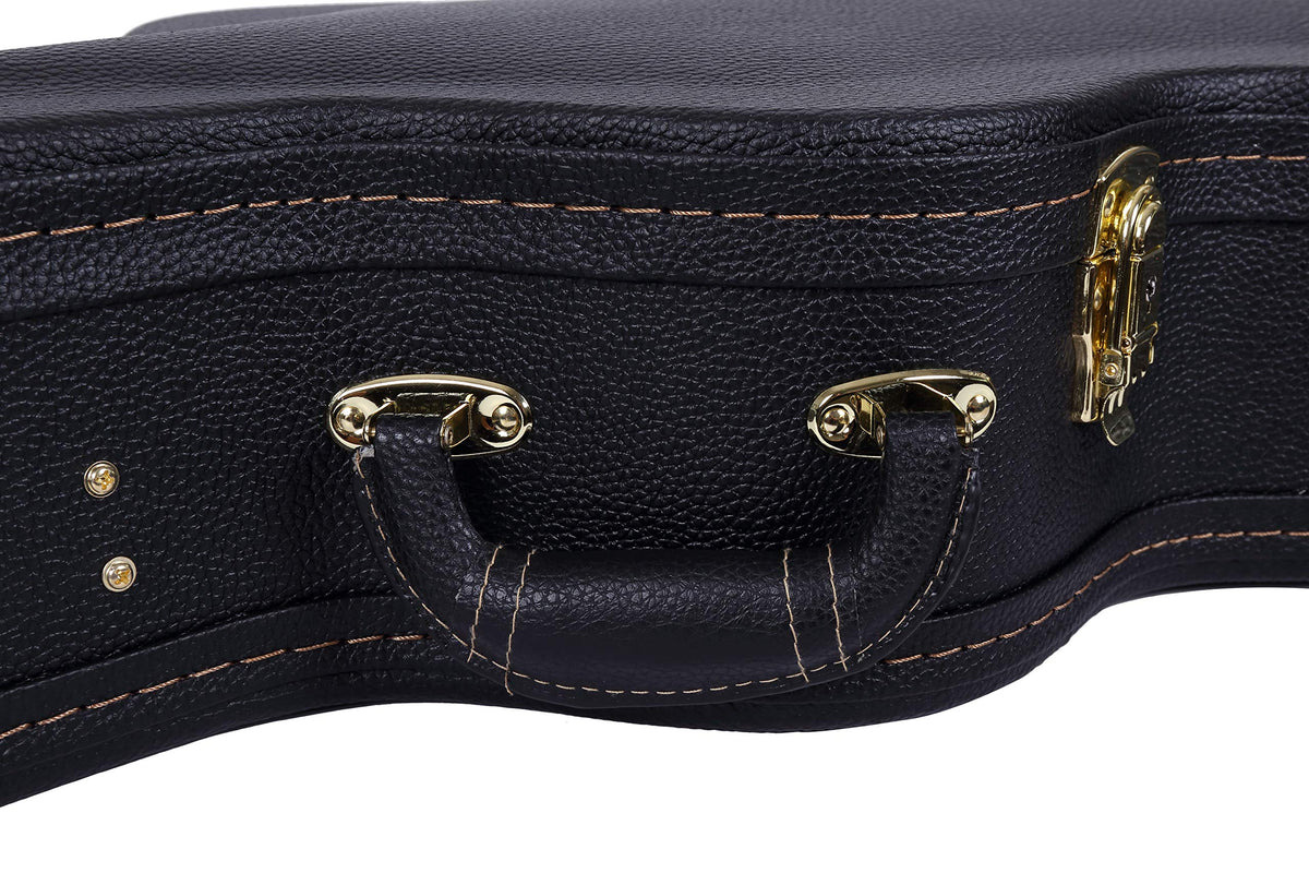 • Q: How does the case protect the guitar during travel? A: The case has a thick, dense layer of foam padding and upgraded deluxe latches to provide protection against damage, dings, and bumps.