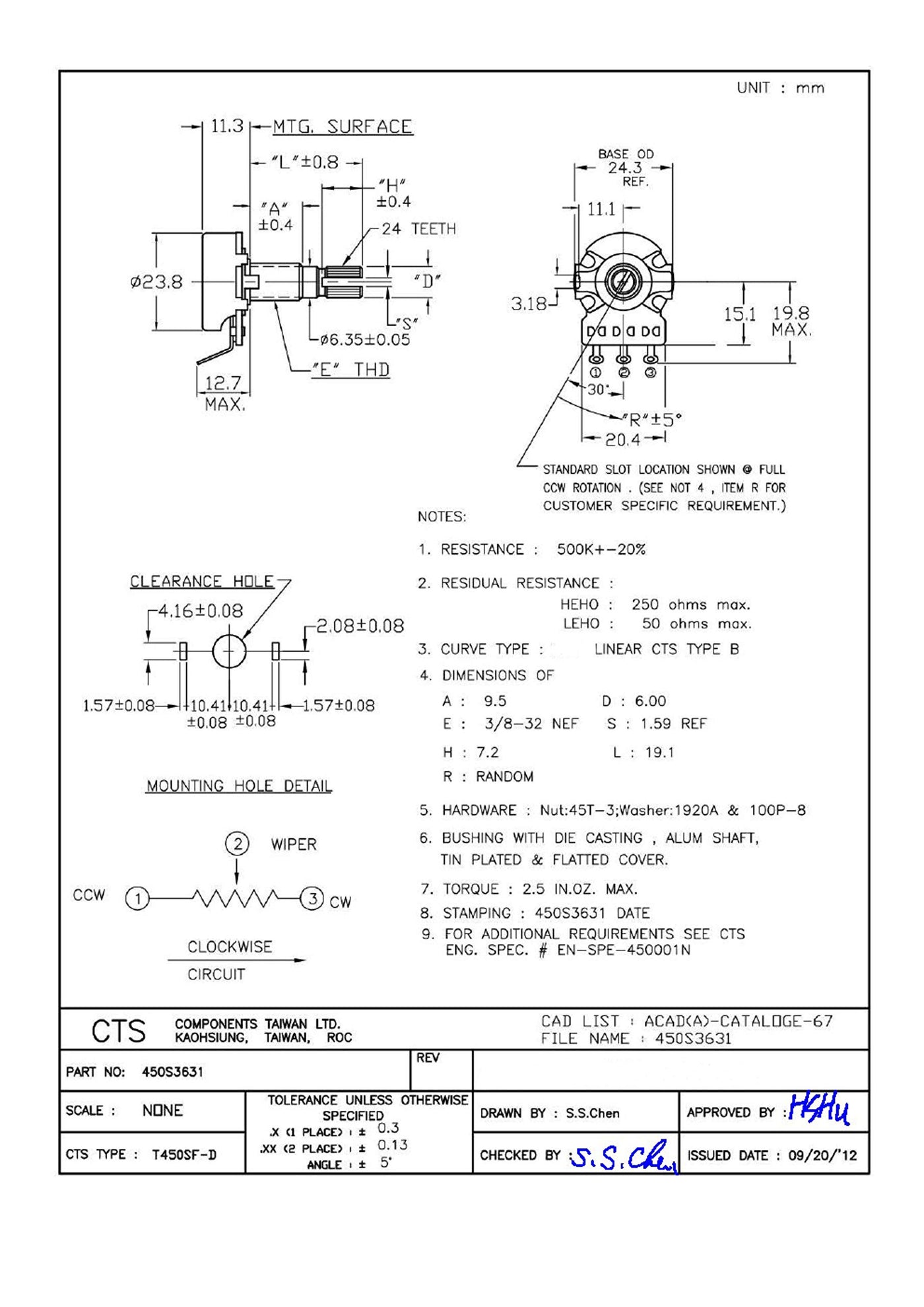 • Q: What are the dimensions of the CTS 500K potentiometer? A: The CTS 500K pot features a shaft length of 18.5mm, shaft diameter of 6mm, and a base diameter of 24mm.