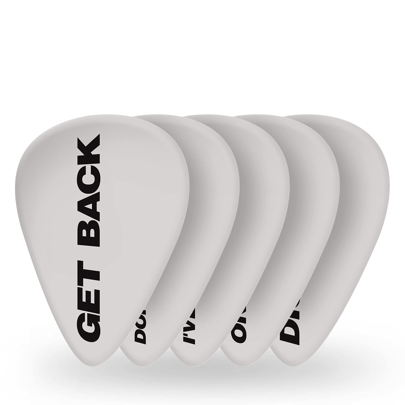 - Q: What song titles are printed on the Beatles guitar picks? A: The picks feature song titles such as Get Back, Dig A Pony, Don't Let Me Down, One After 909, and I've Got a Feeling.