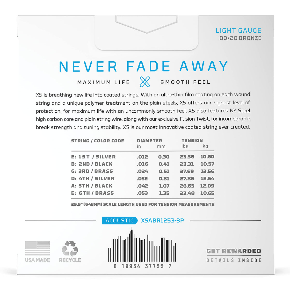 D'Addario Acoustic Guitar Strings, XS 80/20 Bronze Coated, XSABR1253-3P, Light Gauge 12-53, 6-String Set, Pack of 3
