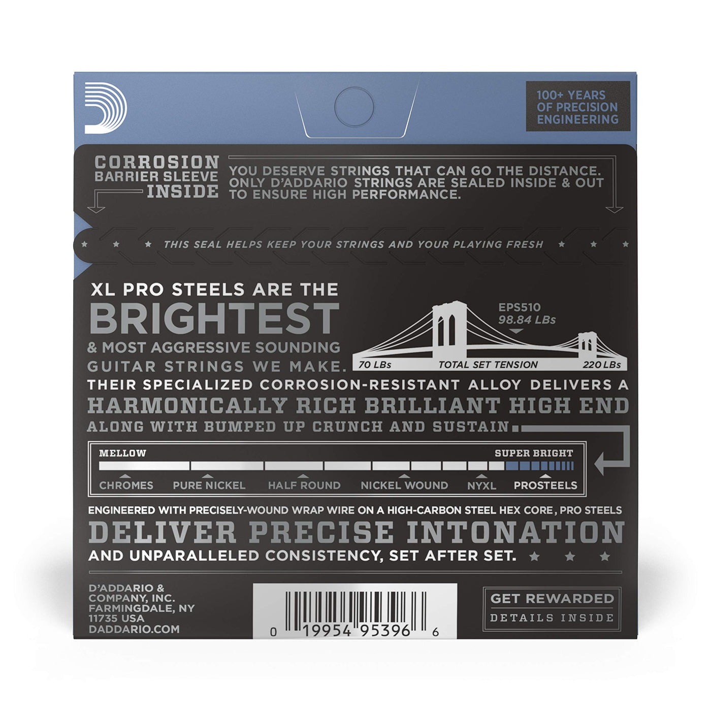 - Q: What are the gauge specifications for D'Addario EPS510 ProSteels Electric Guitar Strings? A: The D'Addario EPS510 ProSteels Electric Guitar Strings have a Regular Light gauge with string gauges of Plain Steel .010, .013, .017, and ProSteels Wound .026, .036, .046.