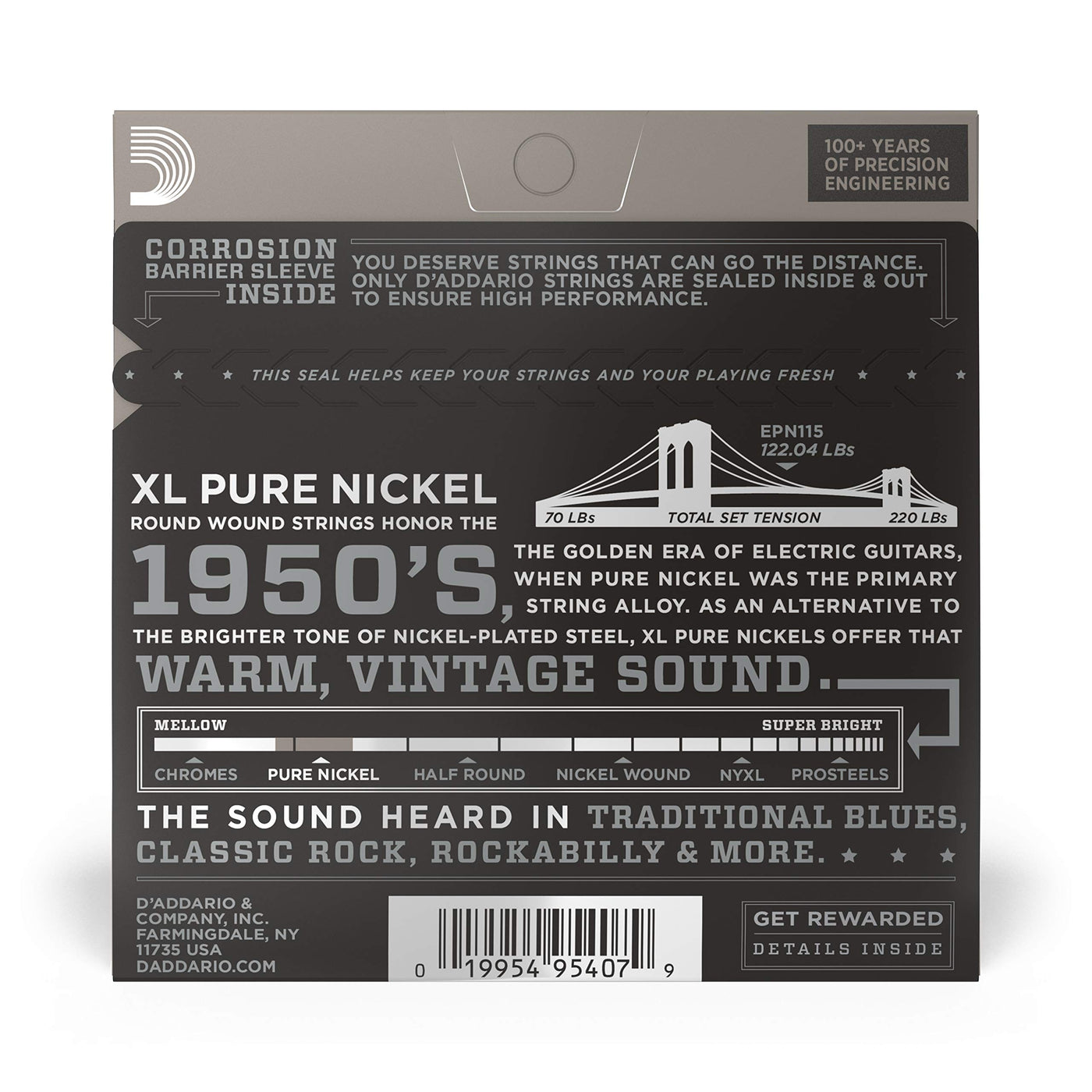 D'Addario Guitar Strings - XL Pure Nickel Electric Guitar Strings - Round Wound - Warm, Bright, Vintage Sound - EPN115 - Blues/J