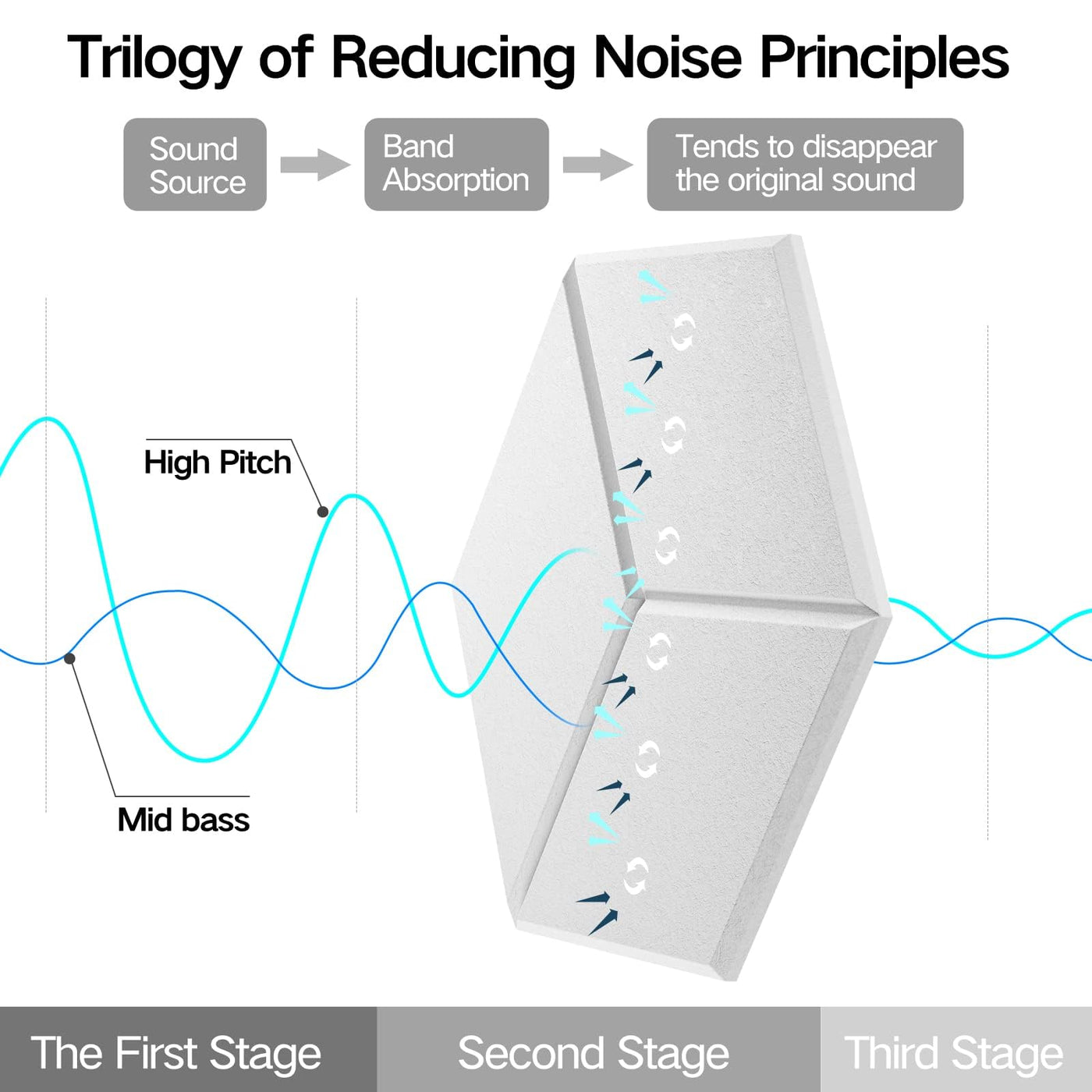 - Q: What are the dimensions of each acoustic panel? A: Each hexagonal acoustic panel measures 12 inches by 10 inches by 0.4 inches.