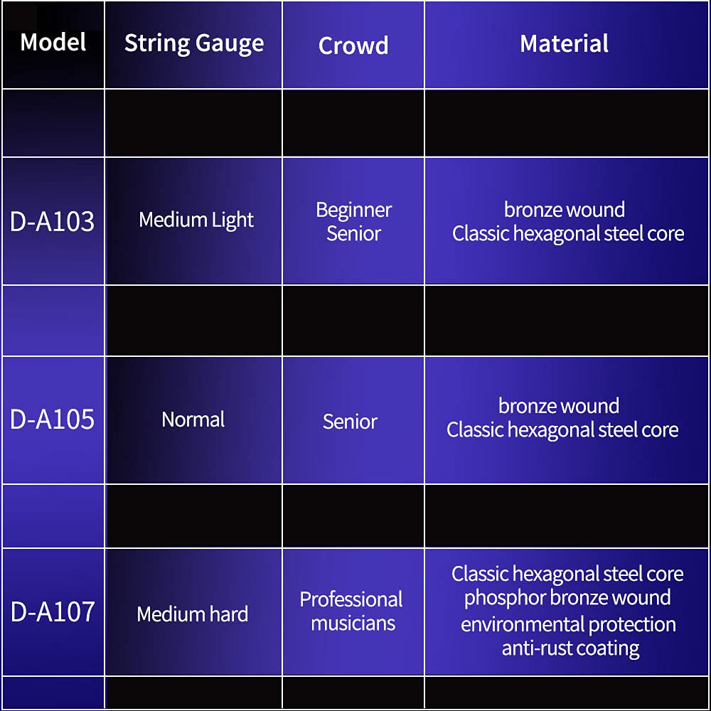 • Q: What materials are used in Danchet A107 Acoustic Guitar Strings? A: The Danchet A107 Acoustic Guitar Strings are made from a classic hexagonal steel core with phosphor bronze winding, featuring an environmental protection anti-rust coating.