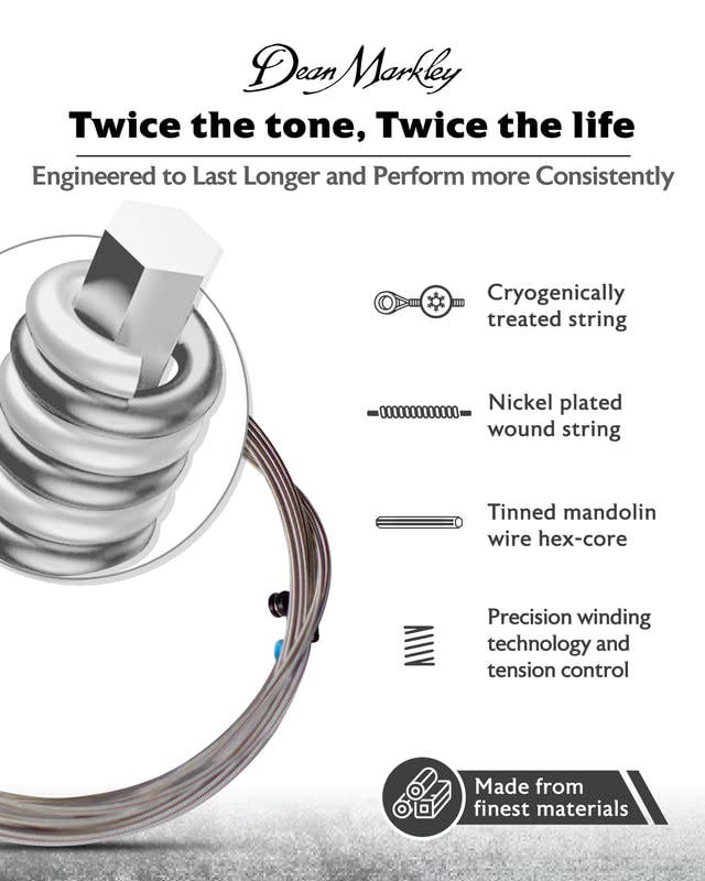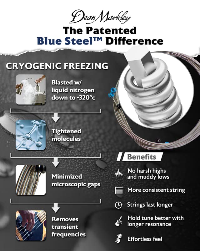 • Q: What are Dean Markley Electric Bass Guitar Strings made of? A: Dean Markley Electric Bass Guitar Strings are made with cryogenically treated stainless steel, which enhances their durability and resistance to breakage and corrosion.