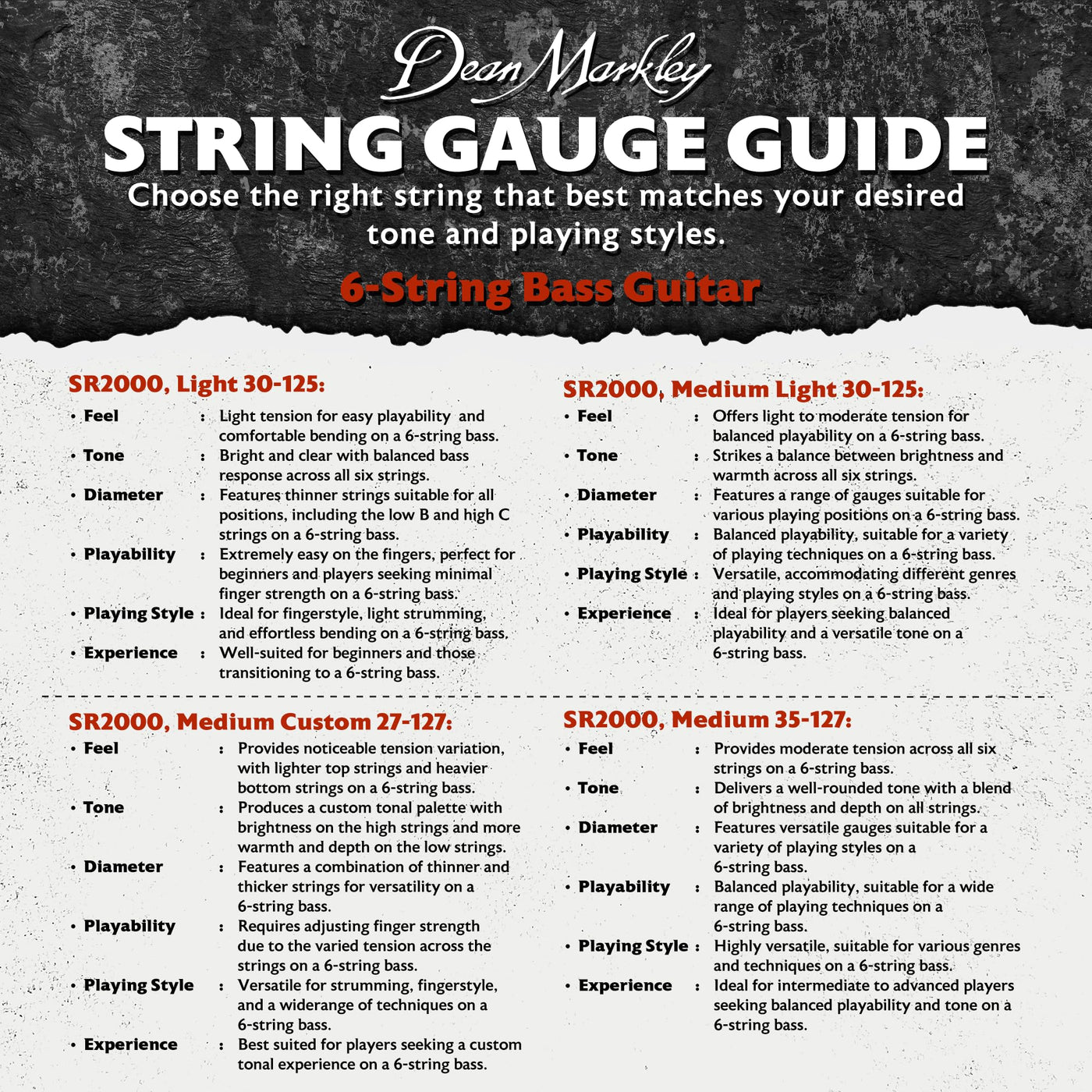 - Q: What is the gauge range for the SR2000 6 string set? A: The Dean Markley SR2000 6 string set features gauges ranging from 27 to 127, providing options for medium custom playing.