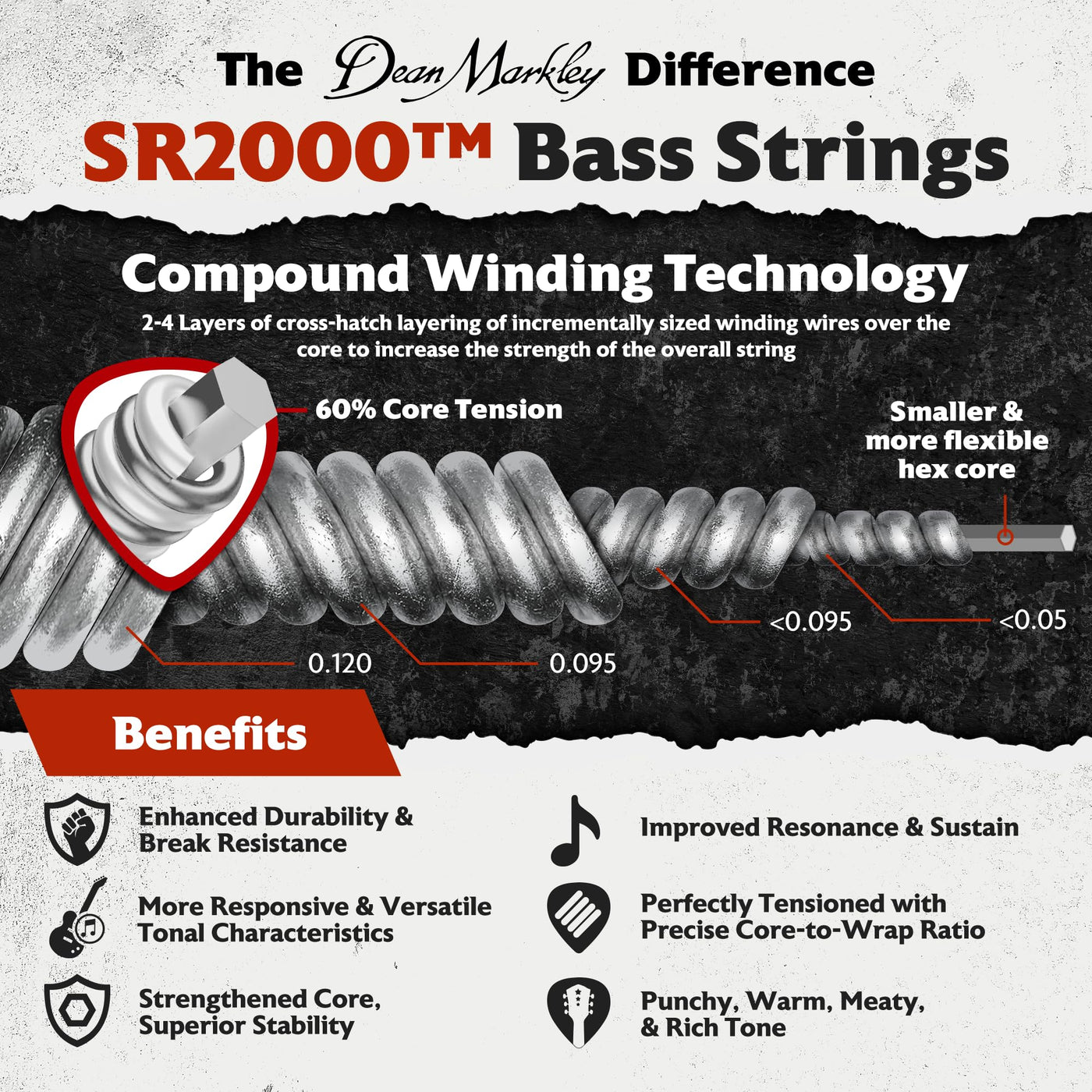 - Q: What material are the Dean Markley SR2000 bass guitar strings made from? A: The Dean Markley SR2000 bass guitar strings are made with stainless steel over a hex core, providing durability and a lasting tone.
