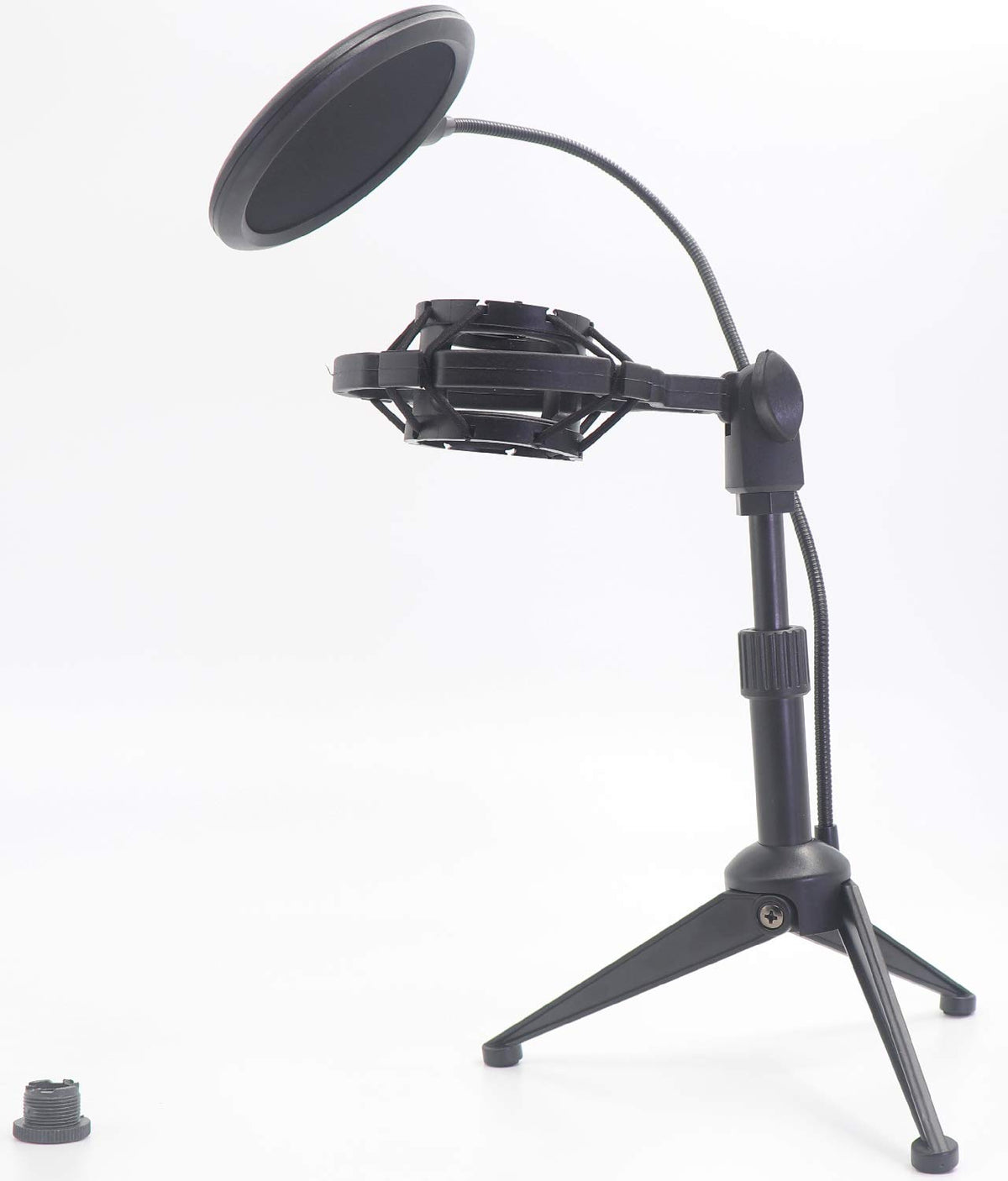 Desktop Microphone Tripod Suspension Stand with Shock Mount Anti-Vibration Mic Holder and 4'' Round Mask Shield Double-Net Wind