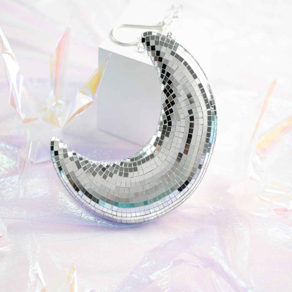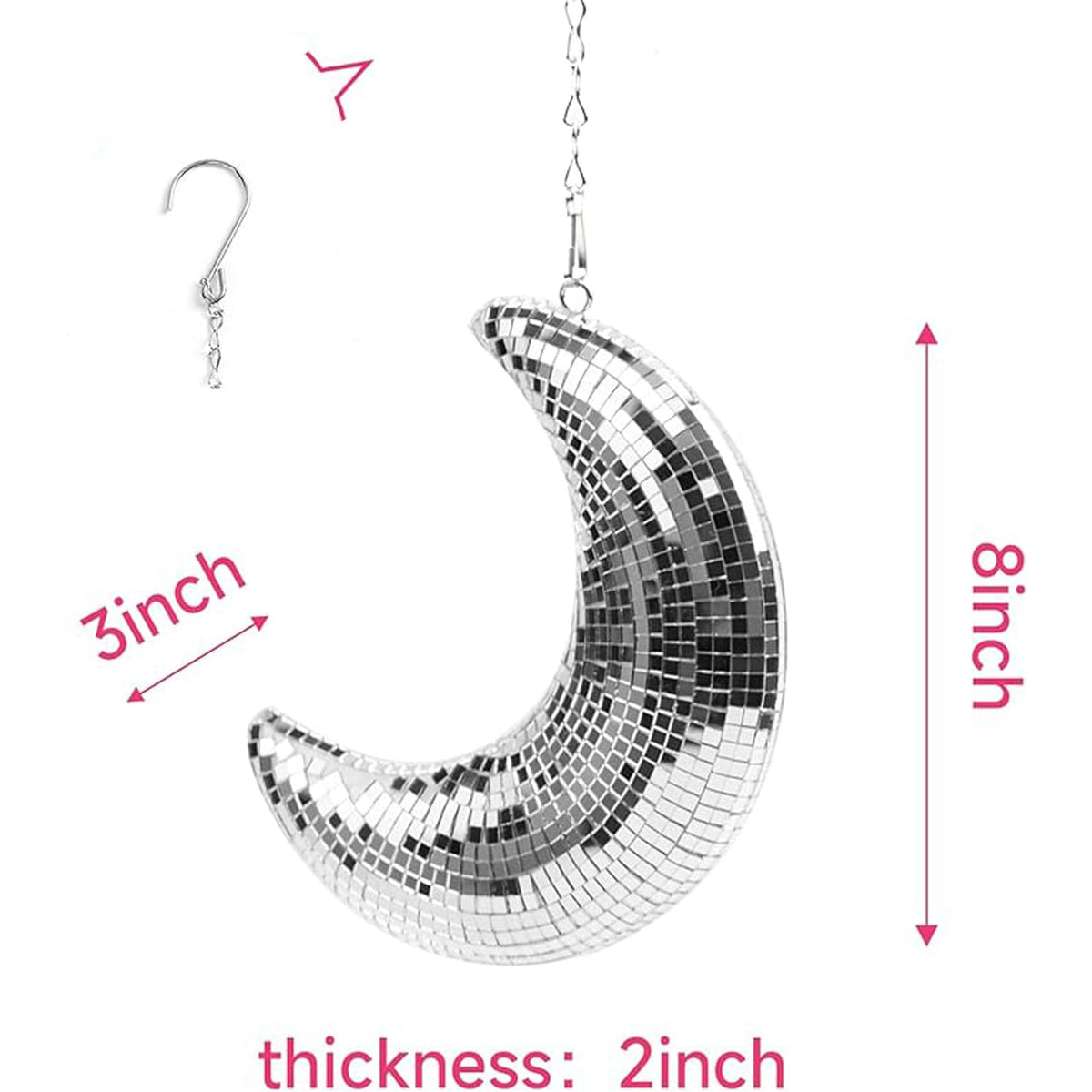 - Q: What is the size of the Disco Ball Moon Shaped Decor? A: The Disco Ball Moon Shaped Decor measures 8 inches in size.