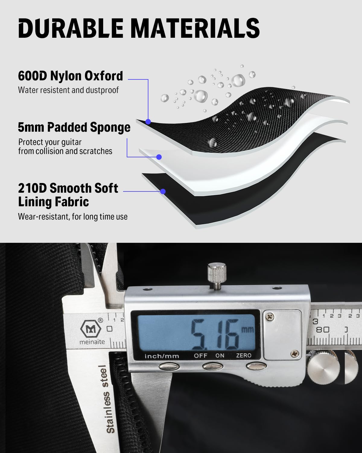 - Q: What materials are used in the construction of this guitar bag? A: The guitar bag is made from durable water-resistant 600D ripstop nylon with a 0.3-inch padded sponge for protection, and a smooth 210D soft lining fabric.