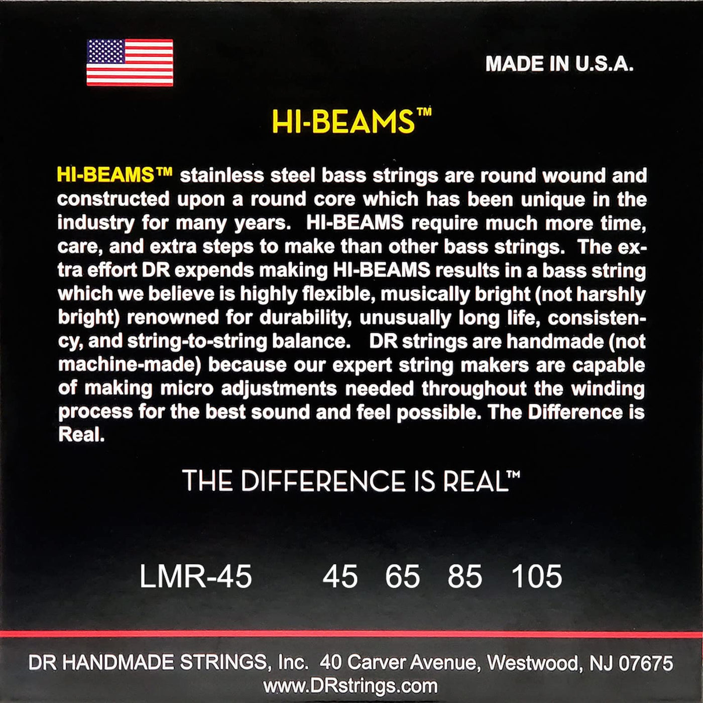 • Q: What are DR Strings Hi-Beam bass strings made of? A: DR Strings Hi-Beam bass strings are constructed with a stainless-steel wrap wire wound on a round core, which enhances flexibility and musicality.