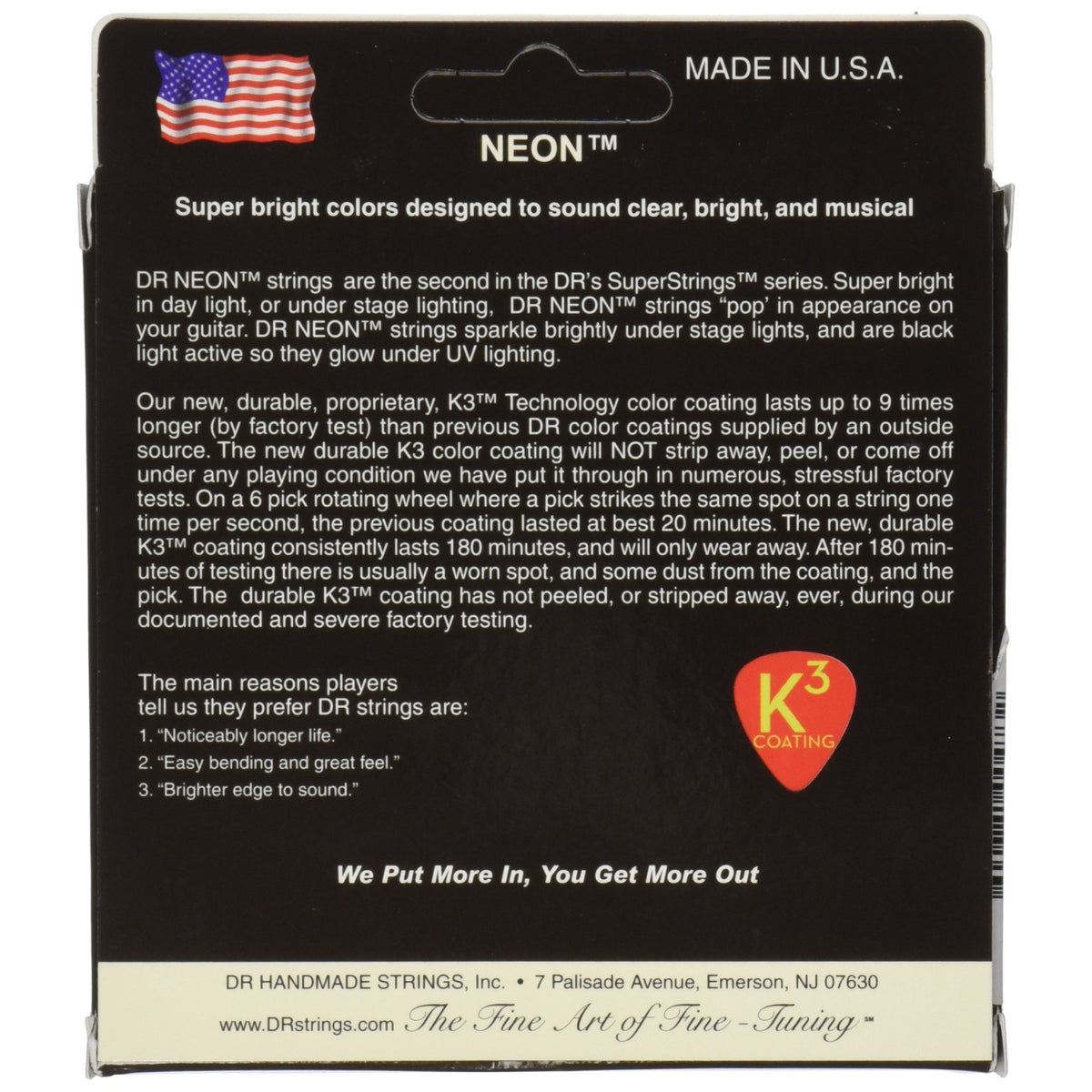 • Q: What are DR Strings HI-DEF NEON Electric Guitar Strings? A: DR Strings HI-DEF NEON Electric Guitar Strings are color-coated electric guitar strings featuring K3 Technology, designed to provide enhanced sound quality and longevity.