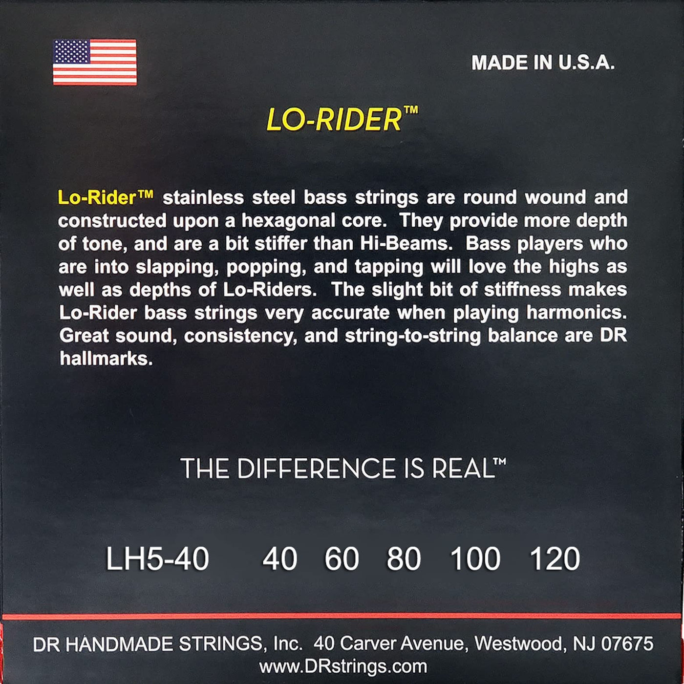 - Q: What is the gauge of the DR Strings Lo-Rider 5-string set? A: The DR Strings Lo-Rider 5-string set has a light gauge of 40-120.