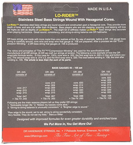 • Q: What are DR Strings Lo-Rider bass strings made of? A: DR Strings Lo-Rider bass strings are made with stainless steel, featuring a round wound design on a hexagonal core.