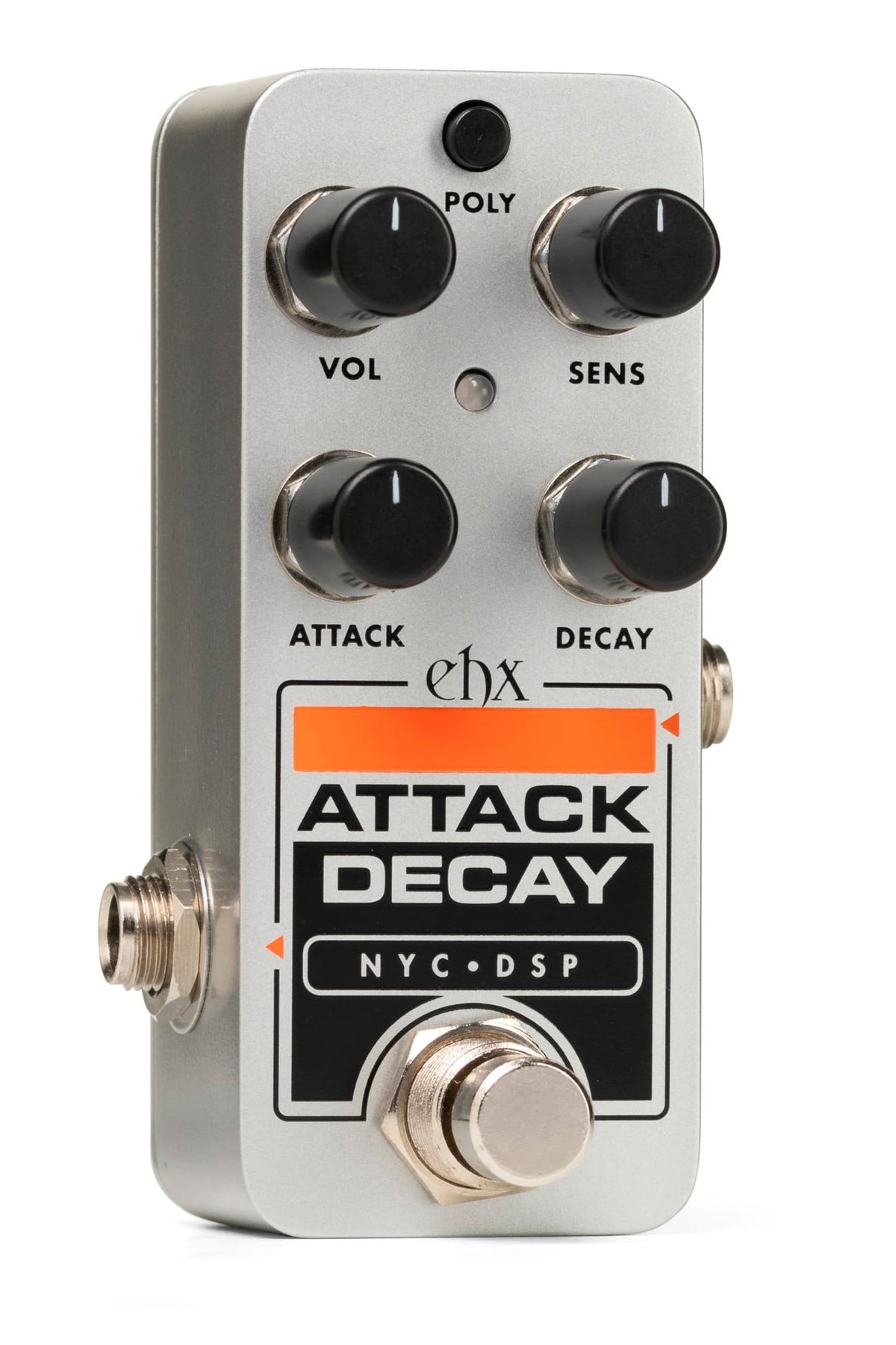 Seductive swells and reverse tape effects push the envelope on any pedalboard! The original Attack Decay Tape Reverse Simulator is known for producing volume and reverse swells, backward tape sounds, artificially short staccato notes, and bowed instrument effects. In 2019 the digital Attack Decay reissue was released, and now the Pico Attack Decay gives us volume envelope effects in a simplified, compact package. The Pico Attack Decay allows you to dial in volume swells and decays, both in Mono mode-one volume envelope for all notes you play-and the revolutionary Poly mode where each note to has its own volume envelope creating cascading swell effects and leads with agile attack smoothing. With intuitive functionality and simple controls, the Pico Attack Decay opens up creative avenues for any player interested in pushing the (volume) envelope. The Pico Attack Decay is both powerful and simple with four knobs and a mode button that let you create a wide variety of effects. The ATTACK knob sets the swell or fade-in speed of the volume envelope while the DECAY knob sets the fade-out speed of the volume envelope. Set the ATTACK higher for languid volume swells. Set the DECAY higher for artificially staccato notes for synth-like punches. SENS adjusts the threshold for triggering the envelope. VOL controls the overall output volume. A hidden BLEND control allows you to blend wet and dry signals for even more flexibility in tone.