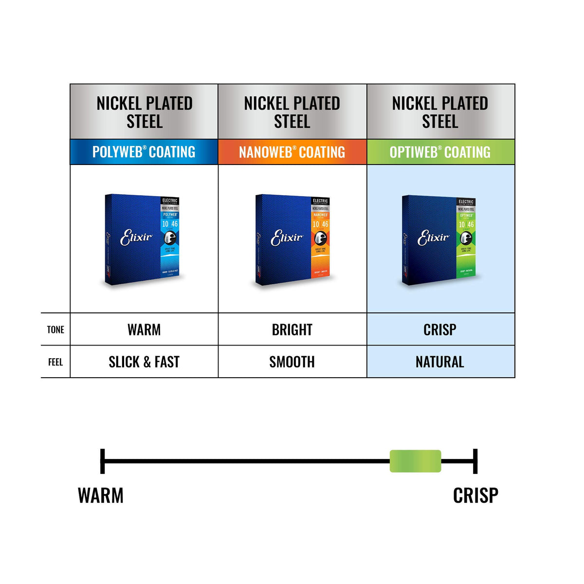 - Q: What benefits does the OPTIWEB Coating provide? A: The OPTIWEB Coating offers a natural feel and maintains the same crisp tone as uncoated strings, while also protecting against corrosion and debris.
