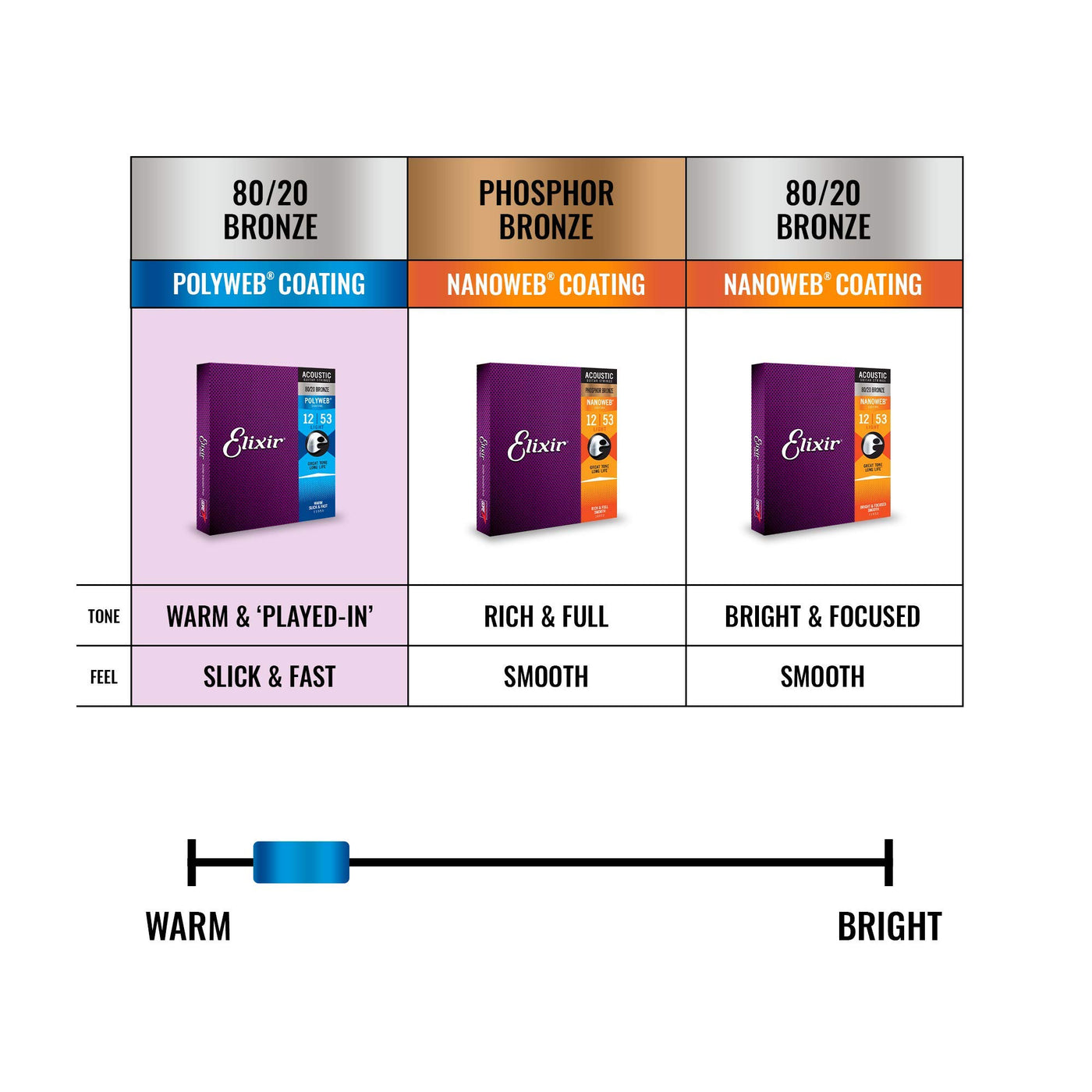• Q: What tone can I expect from Elixir Strings 80/20 Bronze? A: You can expect a warm, robust tone with a clear mid-range presence that feels 'played-in' right out of the pack.