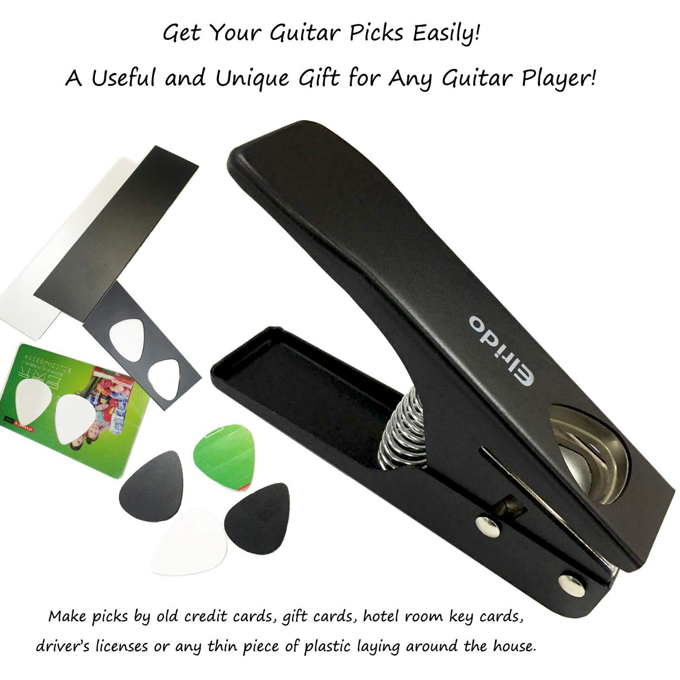 - Q: How do I use the Elrido Guitar Picks Maker? A: To use the Elrido Guitar Picks Maker, simply slide a thin piece of plastic, such as an old credit card, into the cutter and push down the handle. This will punch out a standard-shaped guitar pick.