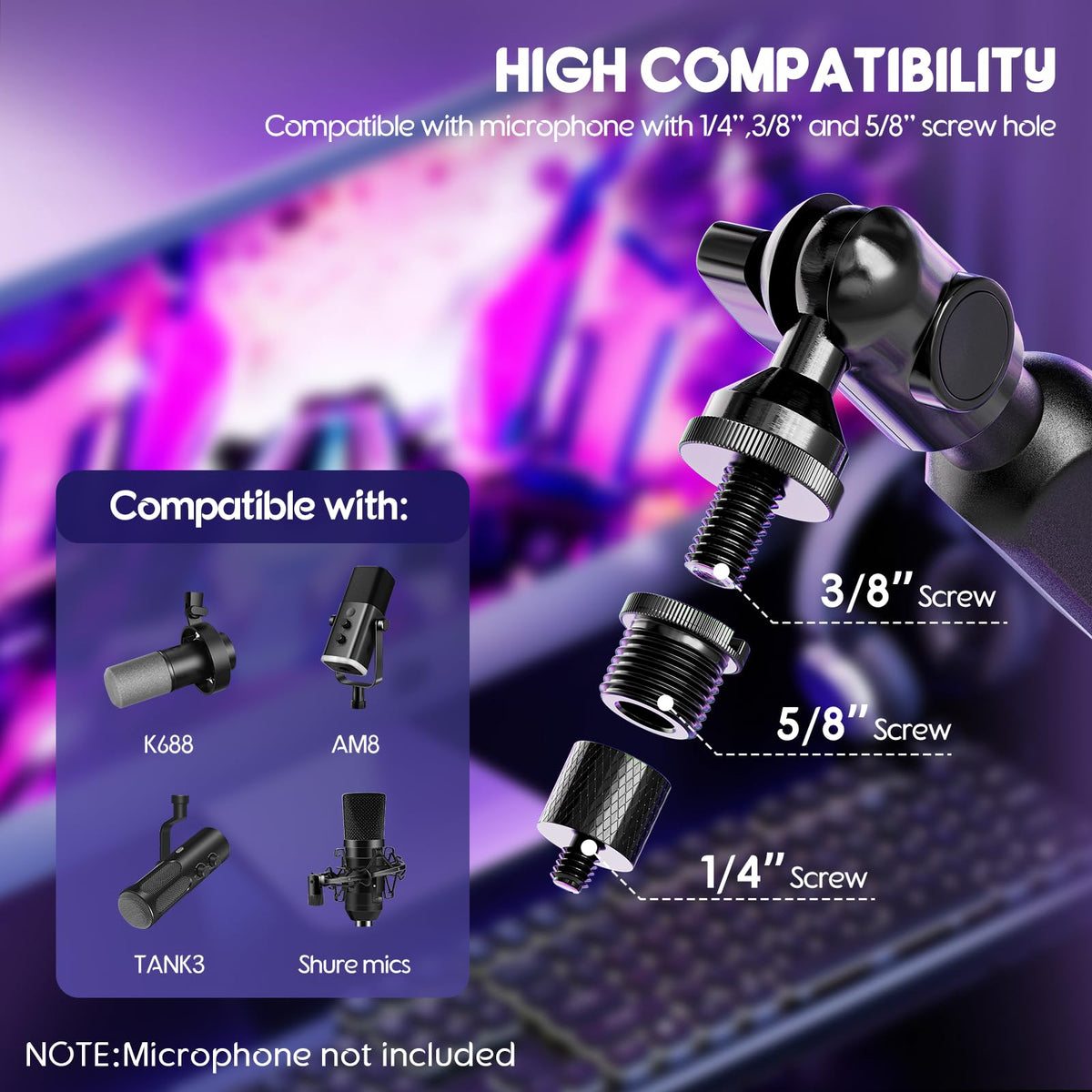 - Q: Is the mic arm compatible with different microphone brands? A: Yes, the mic arm is equipped with 3/8" to 5/8" and 3/8" to 1/4" screw adapters, ensuring compatibility with various microphones, including Blue Yeti, Shure MV7, and Hyper X QuadCast.