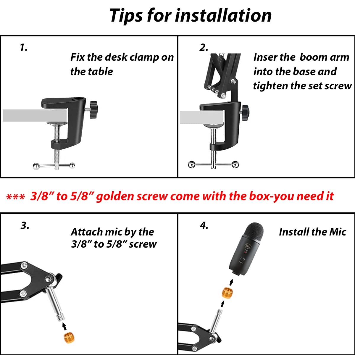 - Q: Are additional accessories included with the Blue Yeti Boom Arm? A: Yes, the Blue Yeti Boom Arm comes with additional accessories, including a desk clamp, a 3/8" to 5/8" adapter, and three cable ties.